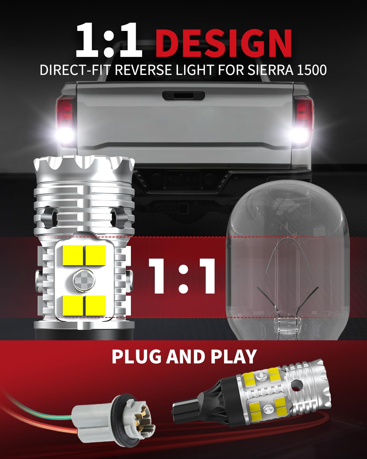 CANBUS Ready, 100% Perfect Fit: Designed for 2014-2025 Sierra 1500 2500 3500 HD, this 921 LED bulb eliminates compatibility issues—no flickering, no error codes, and no need for extra resistors or decoders. A true plug-and-play upgrade that fits perfectly into your car's existing socket