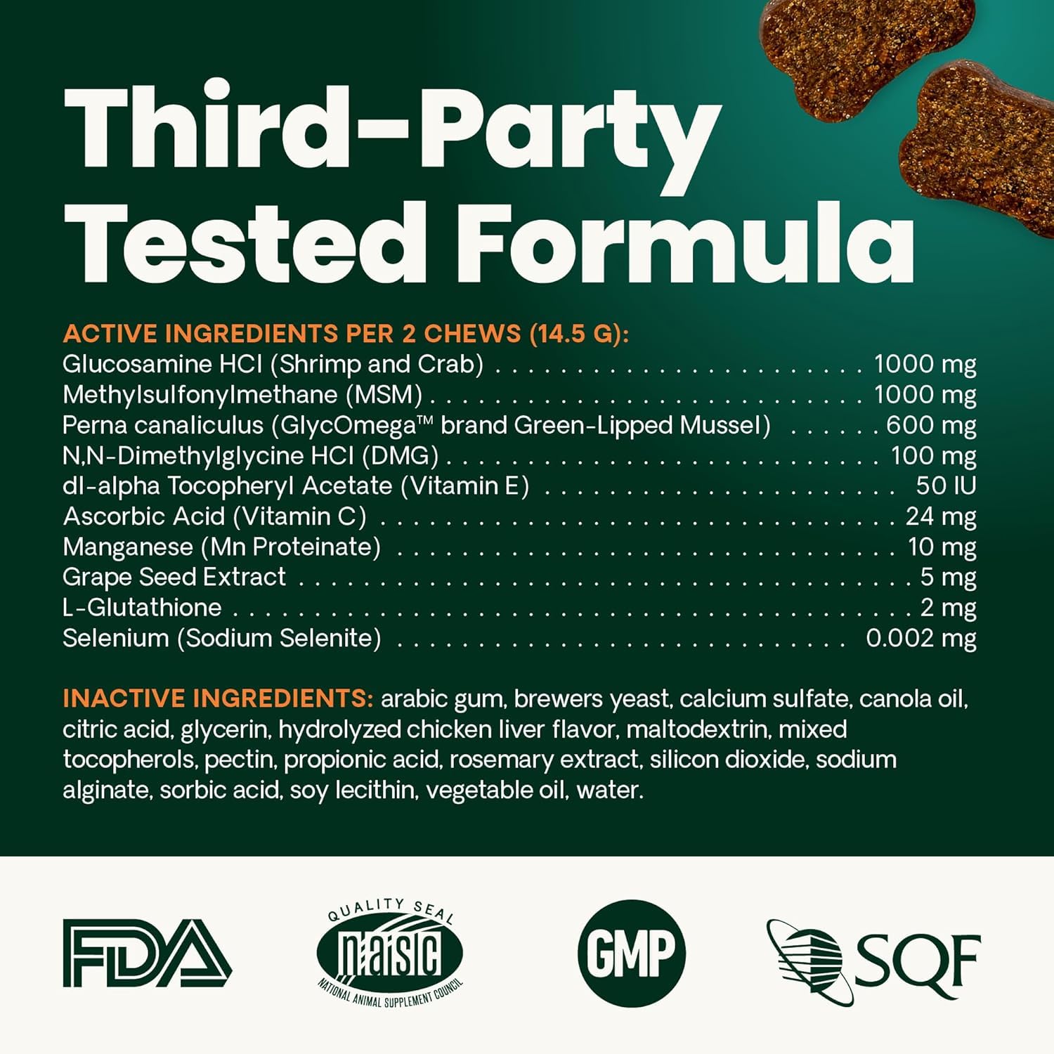 High-Quality Ingredients: Our vet-formulated dog joint supplements are certified by the National Animal Supplement Council (NASC), routinely undergo third-party testing, and contain no hidden ingredients, artificial flavors, or synthetic colors