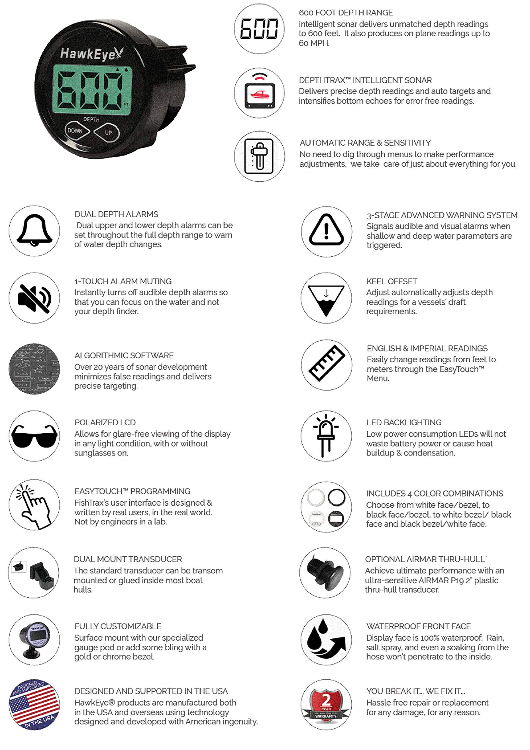 Amazon.com Ideal for power boaters and sailors, the Norcross Hawkeye DF1000D Depth Sounder delivers instant depth updates to help keep you safe in the water. Featuring auto-ranging and auto-sensitivity features, the DF1000D gives precise depth readings (in feet or meters) from 2.5 to 200 feet at speeds up to 63 miles per hour. It also incorporates an advanced three-stage depth alarm warning system with programmable shallow and deep water alarms, while the "Keel-Offset" function allows readings to be adjusted for vessel draft. Today's high-tech, multipurpose depth sounders and fish finders are designed to produce a range of readings, from bottom contour, fish location, and thermoclines, to a variety of other useful sonar data. However, the technology used to decipher between these different signals, coupled with the configuration of their specialized transducers, greatly reduces their ability to give instant bottom readings while on plane. The DF1000D, on the other hand, gives you reliable reading while you're running your boat. Its easy touch, algorithmic, digital programming, waterproof front face, and large, 1.65 x 0.85-inch, illuminated display give you everything you need to make each trip safe and productive. For added convenience, the included transducer can be transom-mounted or glued in. The DF1000D comes with a two year warranty. Product Description The DepthTrax 2B is an updated version of DepthTrax 1B. Following years of exhaustive RandD and field testing, we've updated the SONAR algorithms of the DepthTrax 2B to literally reach new depths. Now able to reach depths of 600 feet and tuned for high speed performance, the DepthTrax 2B reaches deeper and performs faster than any depth finder we've ever produced. The DepthTrax 2B delivers a combination of performance and affordability unrivaled in any other depth sounder. The foundation of the DepthTrax 2B is our proprietary algorithmic programming, which significantly reduces false readings and products unmatched precision. Depth readings are updated four times per second on the no glare, polarized LCD icon display. We've even incorporated a waterproof plud and play transducer connector and a waterproof fuse holder. Finally, we've perfected customization with our patented interchangeable face/bezel system. The DepthTrax 2B includes white/black face-plates and trim rings, allowing custom matching to most boat dash configurations. We even throw in a storage sun cover for good measure. The DepthTrax 2B comes standard with HawkEye's exclusive high-speed, dual-mount transducer that can be transom mounted or glued inside most boat hulls. Ideal for power boaters and sailors, the Norcross Hawkeye DF1000D Depth Sounder delivers instant depth updates to help keep you safe in the water. Featuring auto-ranging and auto-sensitivity features, the DF1000D gives precise depth readings (in feet or meters) from 2.5 to 200 feet at speeds up to 63 miles per hour. It also incorporates an advanced three-stage depth alarm warning system with programmable shallow and deep water alarms, while the Keel-Offset function allows readings to be adjusted for vessel draft. Today's high-tech, multipurpose depth sounders and fish finders are designed to produce a range of readings, from bottom contour, fish location, and thermoclines, to a variety of other useful sonar data. However, the technology used to decipher between these different signals, coupled with the configuration of their specialized transducers, greatly reduces their ability to give instant bottom readings while on plane. The DF1000D, on the other hand, gives you reliable reading while you're running your boat. Its easy touch, algorithmic, digital programming, waterproof front face, and large, 1.65 x 0.85-inch, illuminated display give you everything you need to make each trip safe and productive. For added convenience, the included transducer can be transom-mounted or glued in. The DF1000D comes with a two year .