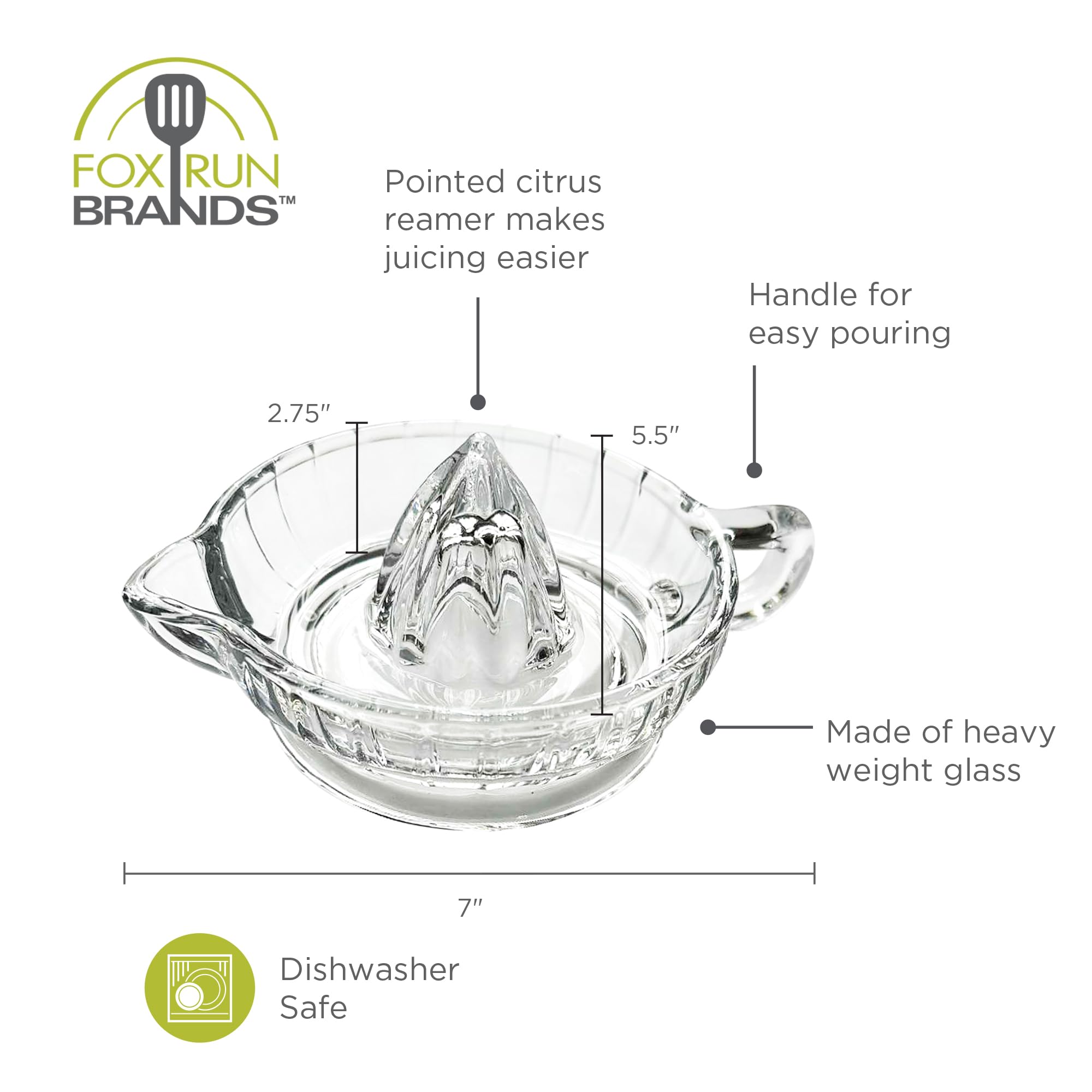 Efficiently juice lemons, limes, oranges and more by hand with the Fox Run Manual Glass Juicer. This glass juicer comes with a pointed reamer in the center to that is designed get the most juice out of your citrus. Then when you are ready to pour out the juice the attached handle and spout make it a mess free process. This lemon juicer is made of heavyweight glass that resists damage caused by citrus acid so that it can last longer than other juicers. Start enjoying your own homemade fresh squeezed juices!