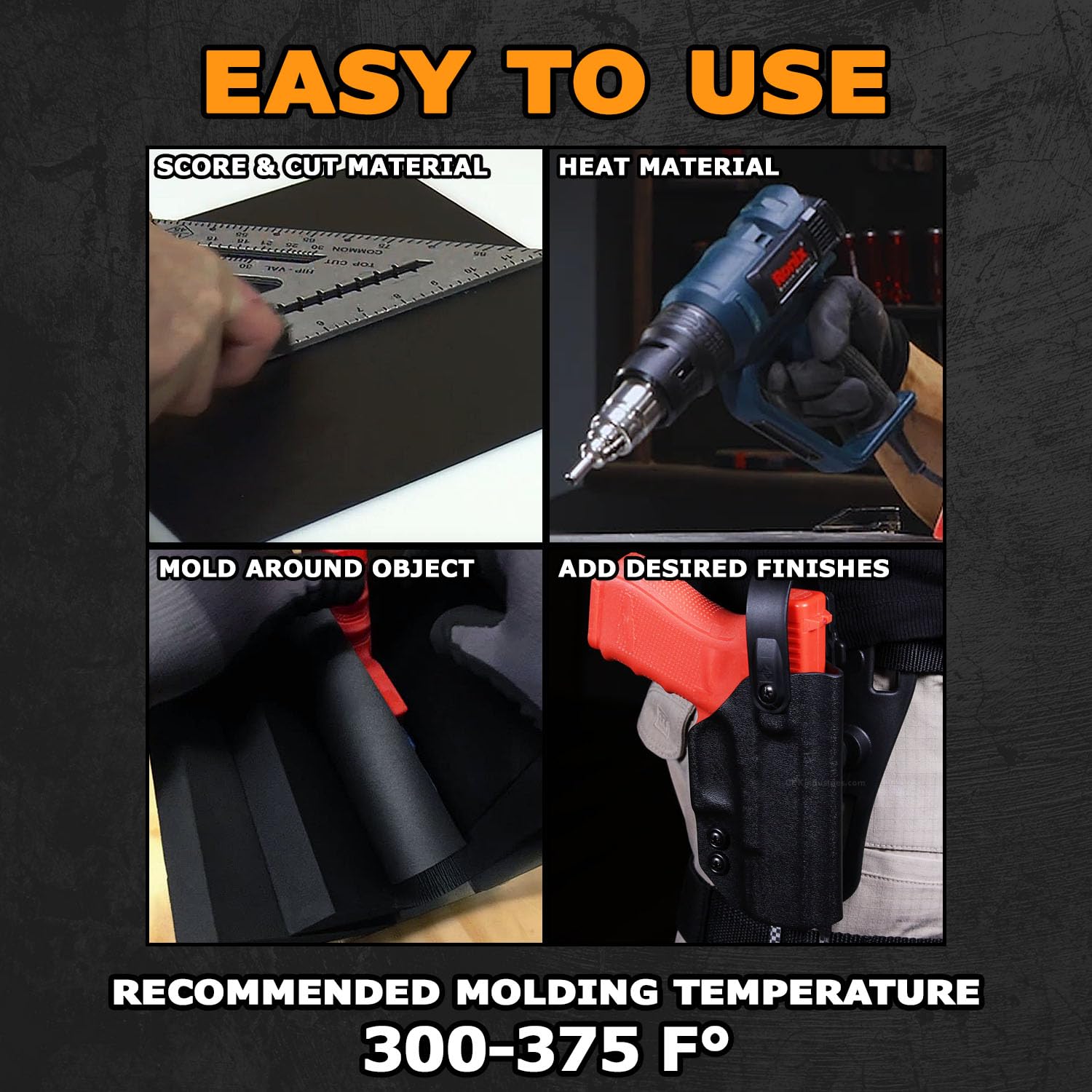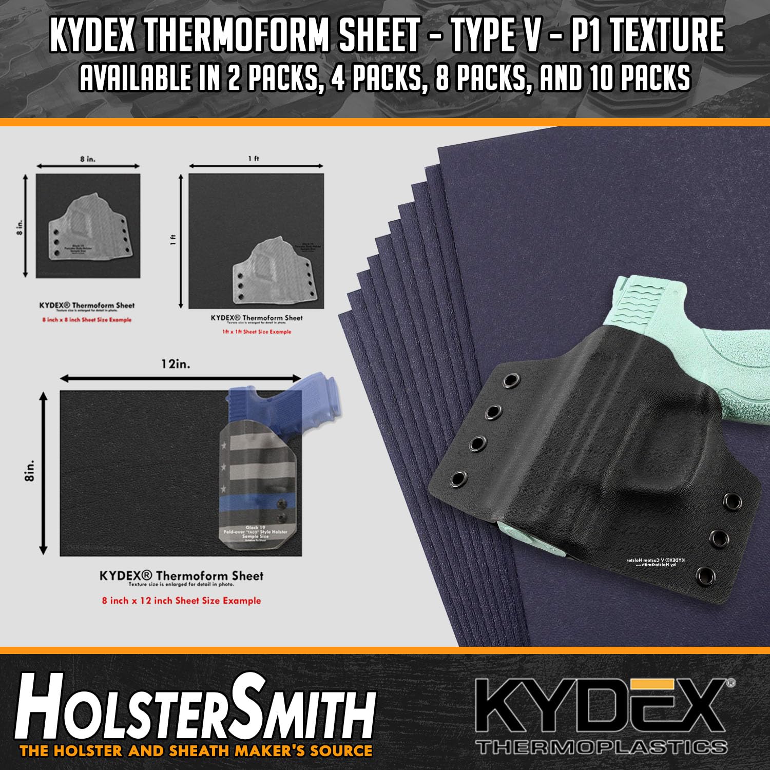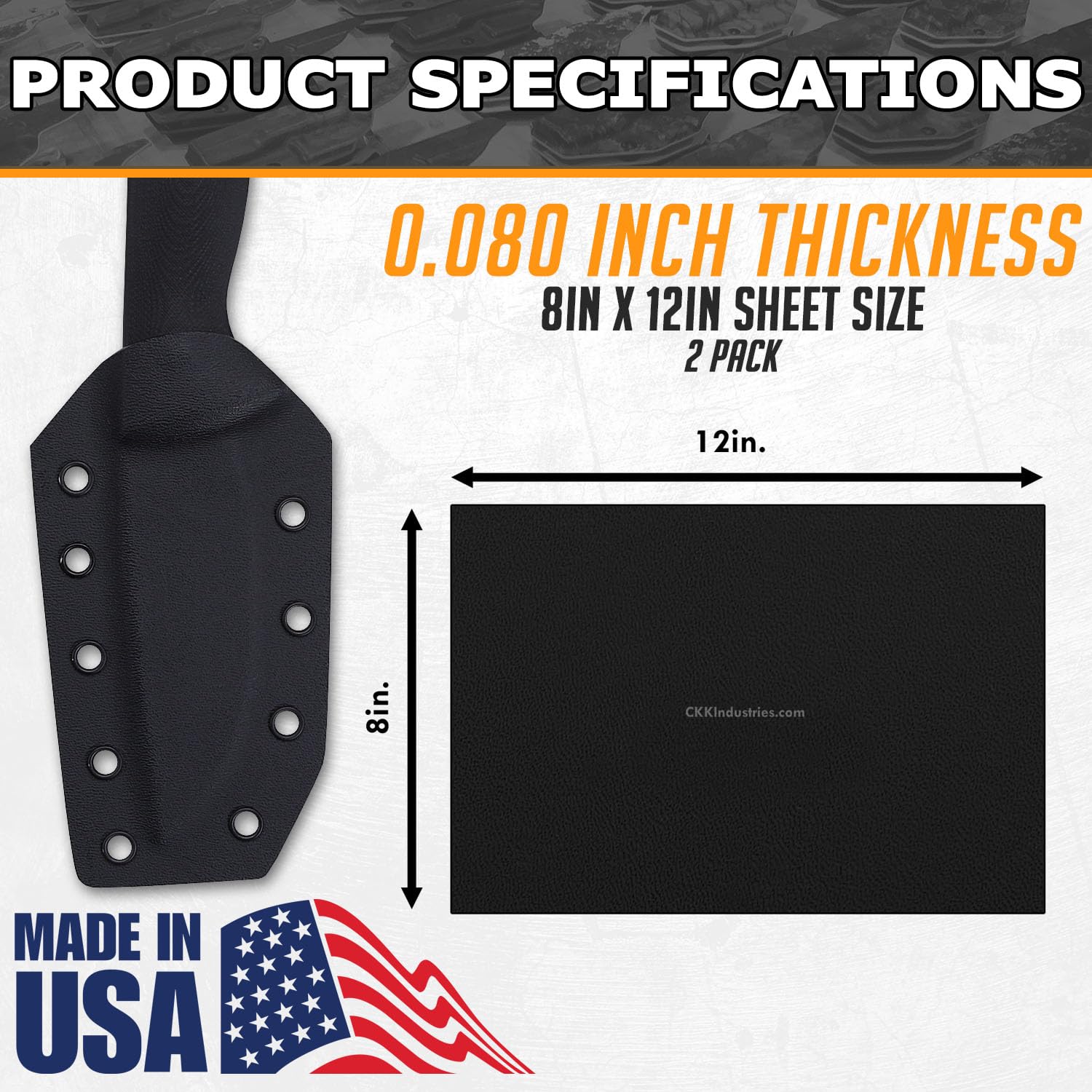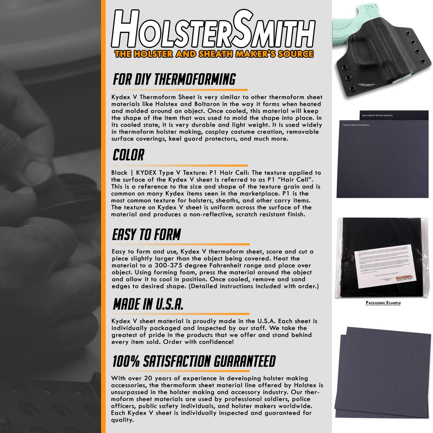 Quantity : (2) 8 in. x 12 in. sheets (nominal cut) | 100% Satisfaction Guaranteed: With over 20 years of experience in developing holster making accessories, the thermoform sheet material line offered by Holstex is unsurpassed in the holster making and accessory industry. Our thermoform sheet materials are used by professional soldiers, police officers, public safety individuals, and holster makers worldwide. Each Kydex V sheet is individually inspected and guaranteed for quality.