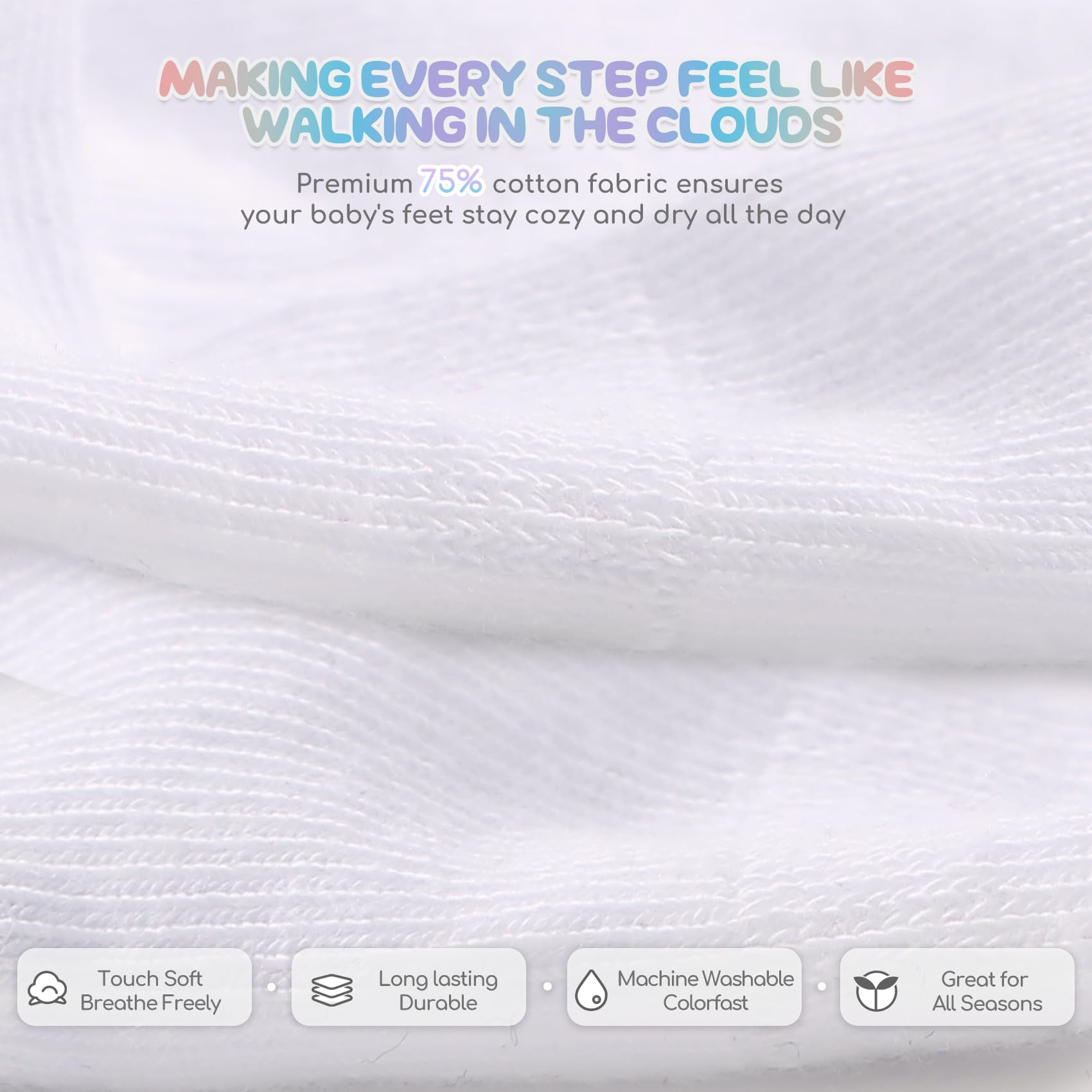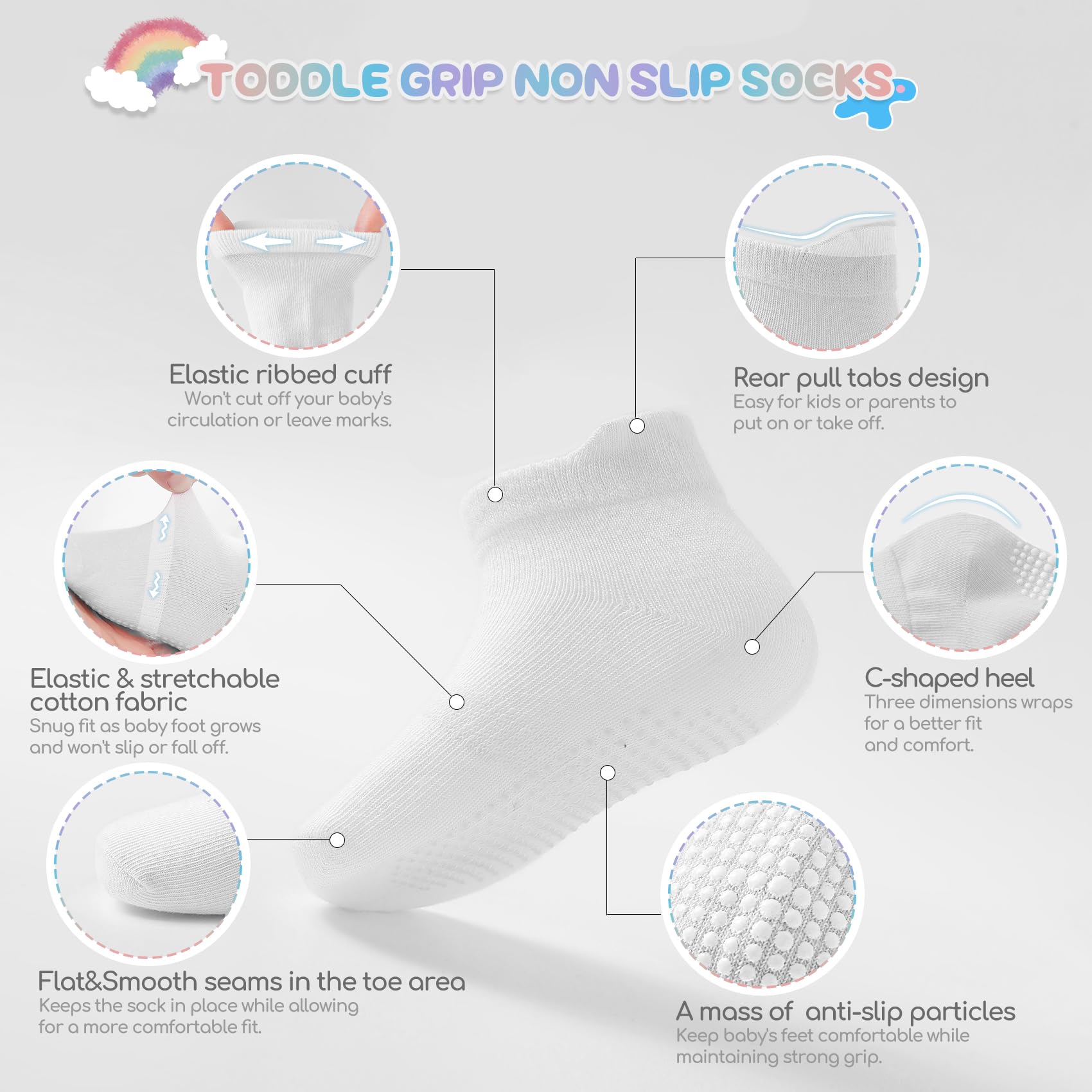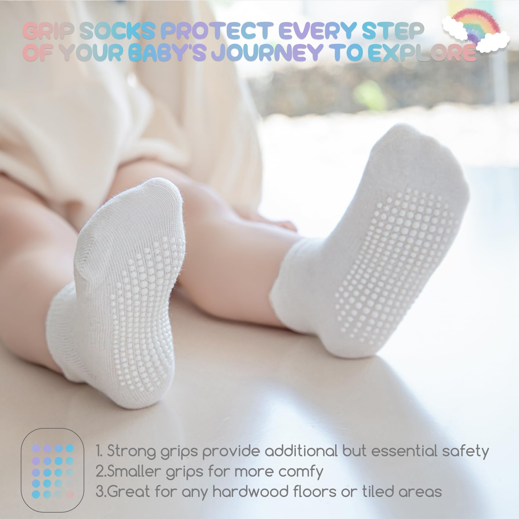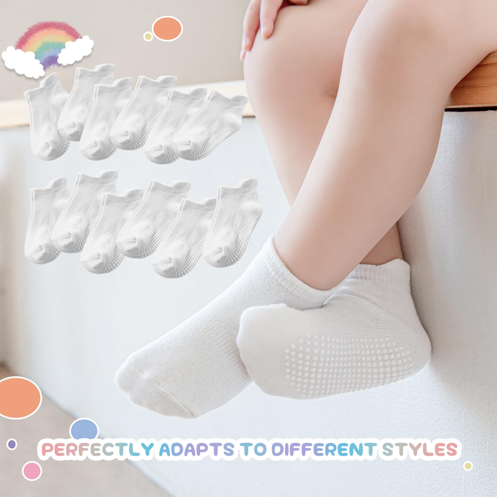 🌈PREMIUM COTTON FABRICS:These socks are made of superior cotton and synthetic fibers, providing a balance between comfort and durability. Elastic and stretchable fabric confirms it won’t slip/fall off while snug fit as baby foot grows.The soft and breathable fabric ensures your kids feet stay cozy and dry throughout the day. The grips on the soles could still maintain their effectiveness even after multiple washes.