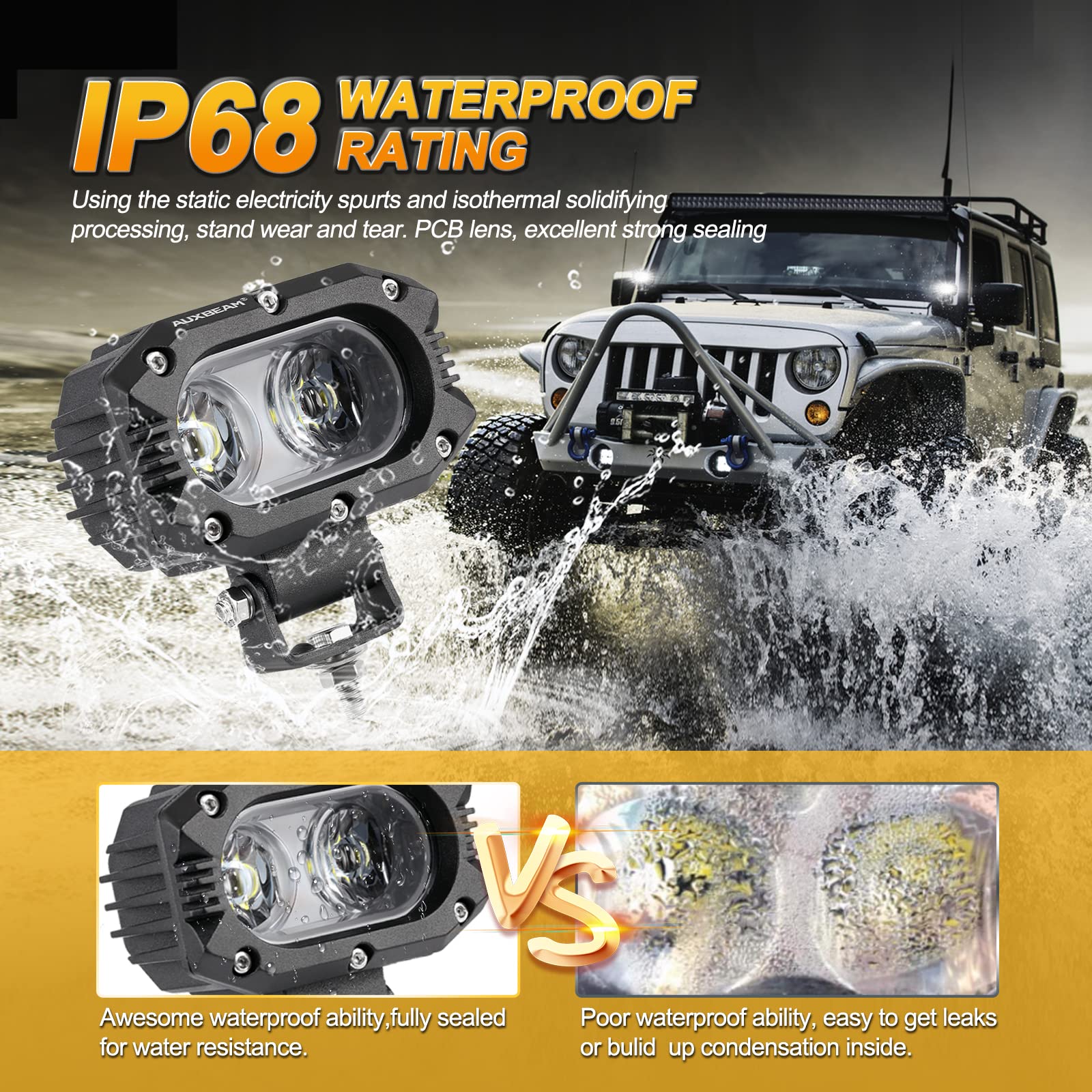 IP68 Waterproof for high Performance. LED driving light has IP68 waterproof rate, protective housing and sturdy brackets. More effectively prevents rain, fog, moisture or dust to get inside the bar and ruin it, great performance of waterproof, dustproof and shockproof