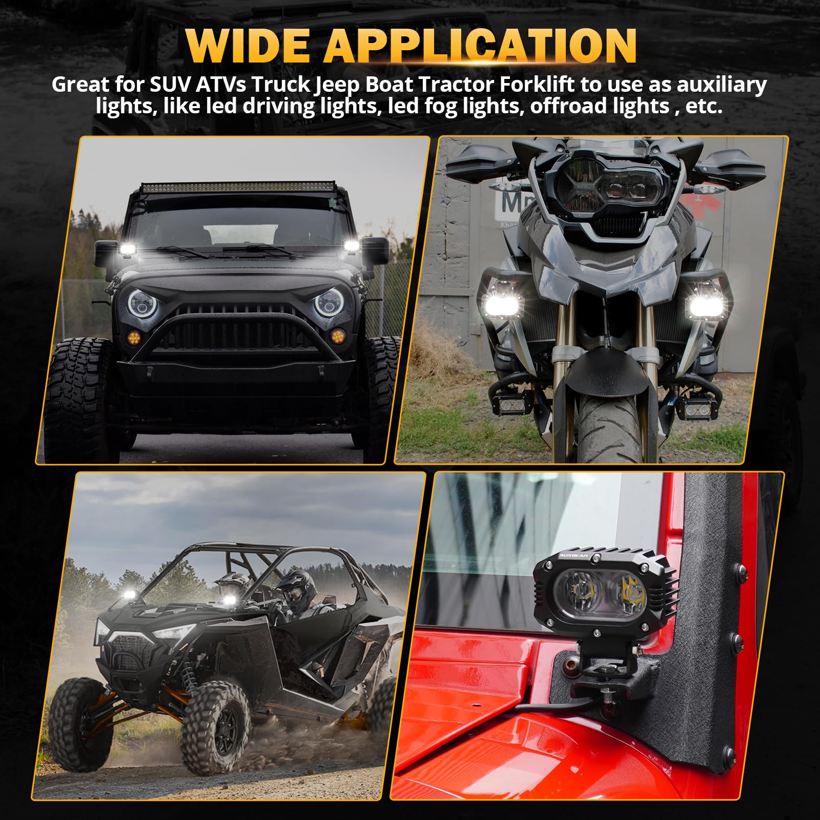 Universal Auxiliary Lights. All lights are burn-in and waterproof tested before leaving the factory. Used for almost all Off Road Vehicles, ATVs, UTVs, SUVs, Construction Vehicles, Farm Vehicles, Trucks, Motorcycles, Buses, Pick-ups, marine, Boat, etc. Operating voltage of 12-80V