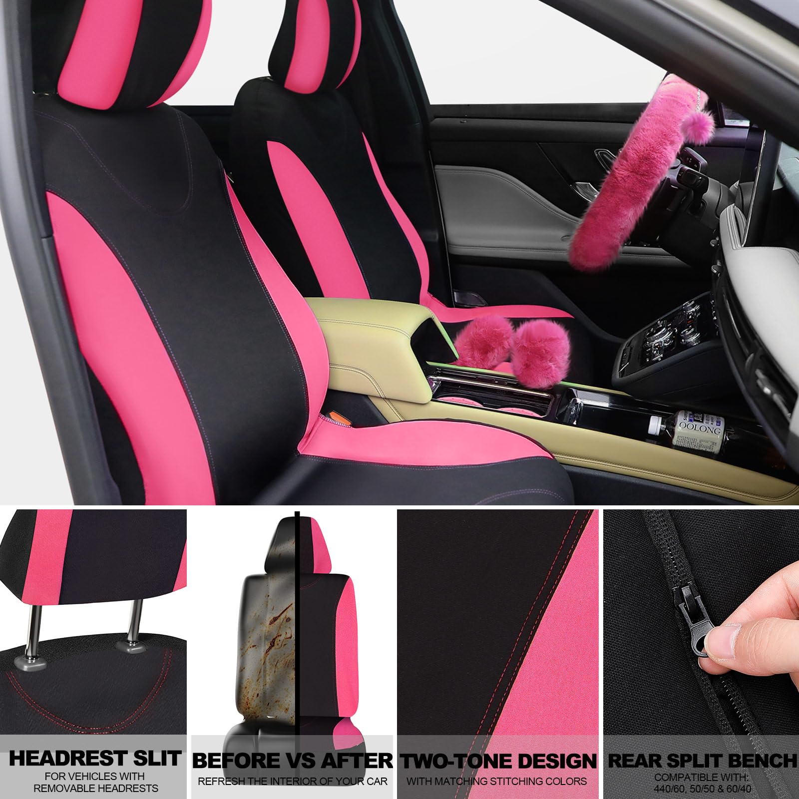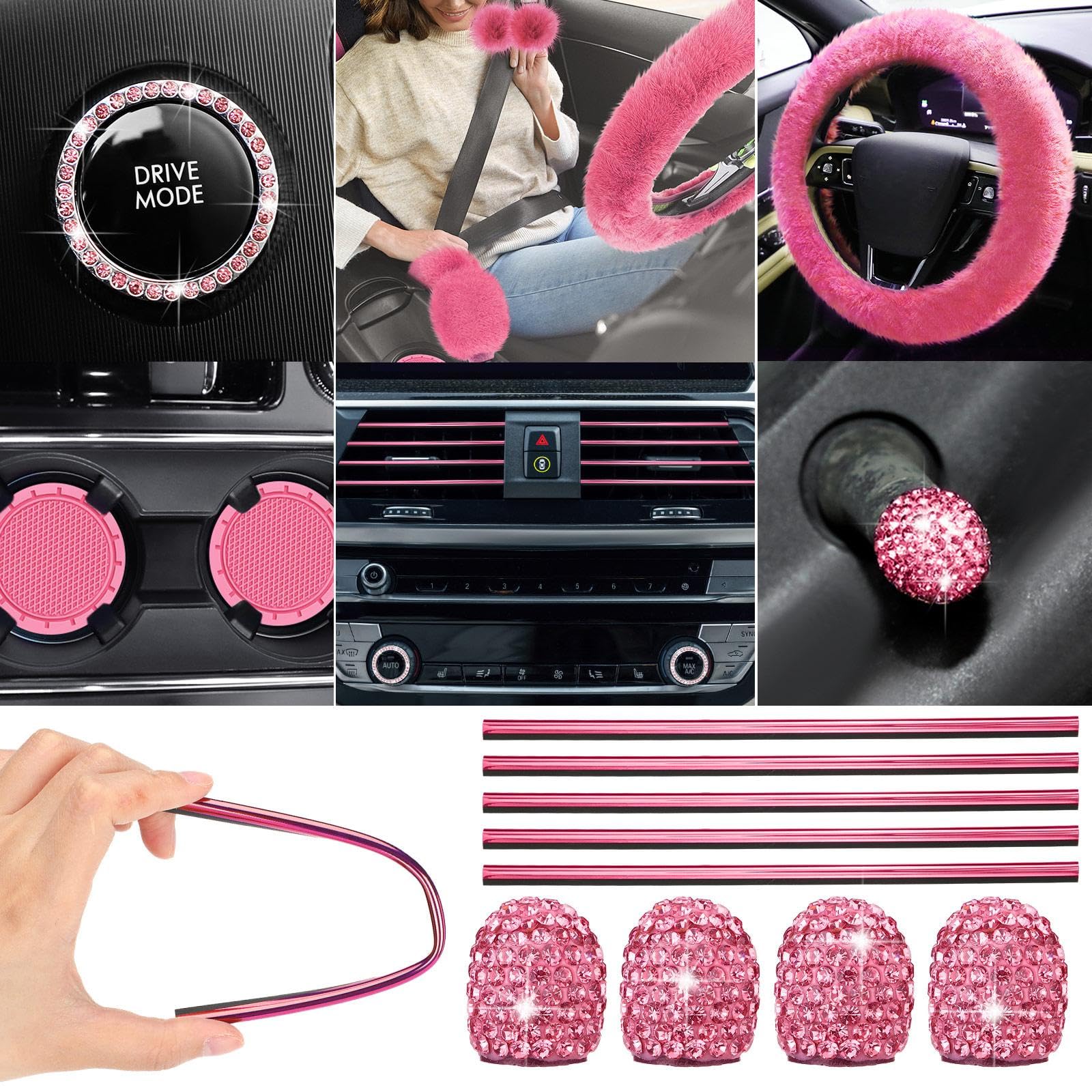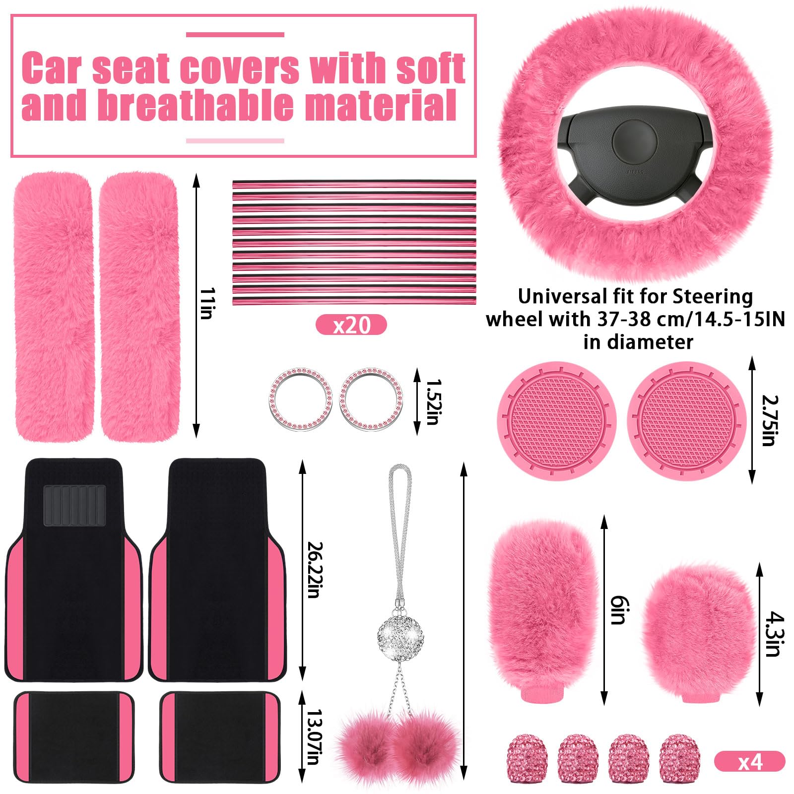 Abundant Car Interior Accessories: you will receive 1 set of pink car decorative accessories, total 47 items including 2 front seat covers, 5 car headrest covers, 2 rear bench seat covers, 1 plush steering wheel cover, 1 handbrake cover, 1 gear shift cover, 2 car coasters, 1 rear view mirror hanging accessories, 2 ring stickers, 2 seat belt pads, 4 car floor mats, 4 tire valve covers and 20 car air outlet trims, can satisfy your decorative needs