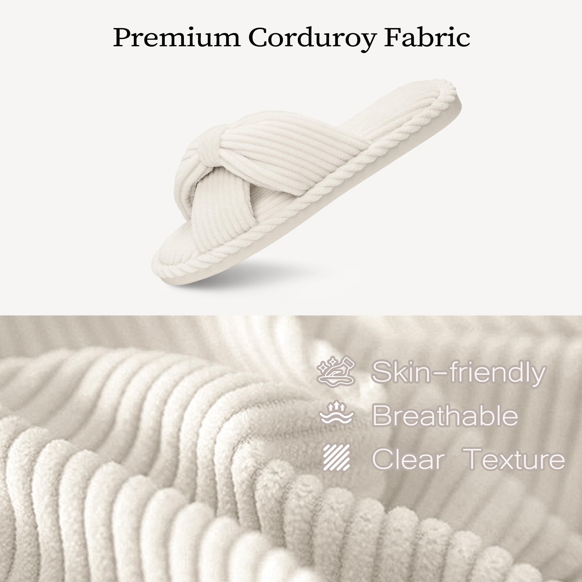 Luxury Materials: Made from high-quality, breathable, skin-friendly corduroy, these slippers wick away moisture and keep your feet cool, making them suitable for all seasons. Filled with the same high-density 10mm memory foam used in sofas, walking in them feels like walking on clouds. The lightweight, slip-resistant rubber outsole is safe and reliable, offering strong traction and quiet performance without damaging floors.