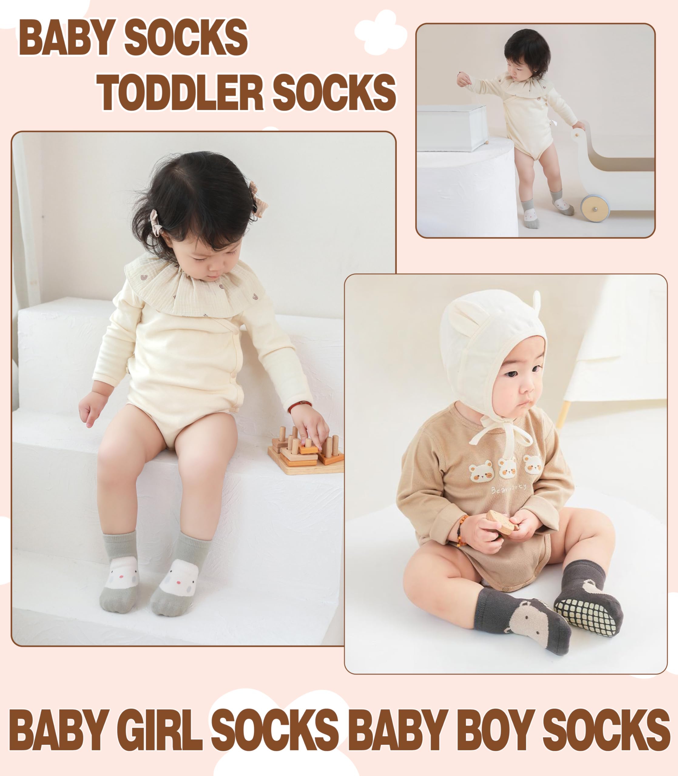 SUPER SOFT COTTON SOCKS - Our baby toddler girls boys socks made of approx 80% cotton, skin friendly Cotton-rich fabric offering all day comfort, breathability and softness to baby's foot,breathe freely, absorb sweat. These baby toddler socks with grips are strong elasticity and not too tight, and fit better, which keep baby toddler socks more stable and won’t fall down easily, you do not worry about leaving marks on the baby ’s chubby ankles and feet.