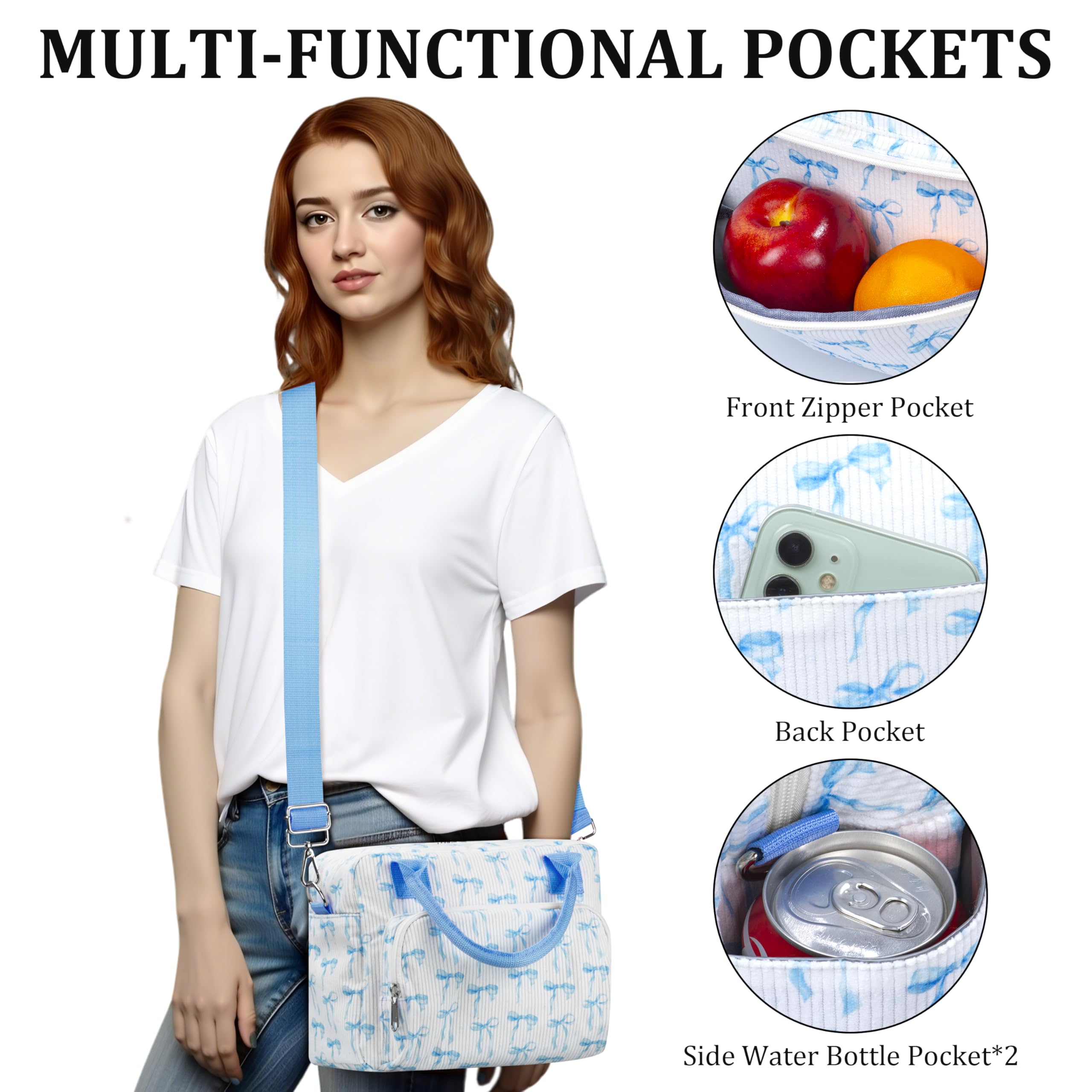 Upgrade your meal prep with our premium insulated lunch bag, designed for both style and functionality! Keeping your meals fresh or chilled is effortless thanks to its professional-grade PEVA lining, which offers waterproof and leak-proof protection for easy cleanup, while the 5mm EPE foam ensures your food stays at the perfect temperature for hours. Measuring 11.61" L x 6.3" W x 9" H with an 10-liter capacity, it can hold 16 cans of 330ml Coke along with all your daily essentials like meals, snacks, utensils, and beverages. Featuring a durable handle and a detachable, adjustable shoulder strap (23"-48"), it adapts to your preferred carrying style—whether as a handbag, shoulder bag, or crossbody. With multiple compartments including a main zippered section for food and drinks, front pockets for small items like wallets and phones, two side pockets for beverages, and a back pocket for utensils, it’s perfect for organized storage. Its cute and modern design suits both women and men, adding charm to any occasion, and it doubles as a casual tote or makeup bag—ideal for the office, beach, or picnics, ready to accompany you wherever your day takes you!