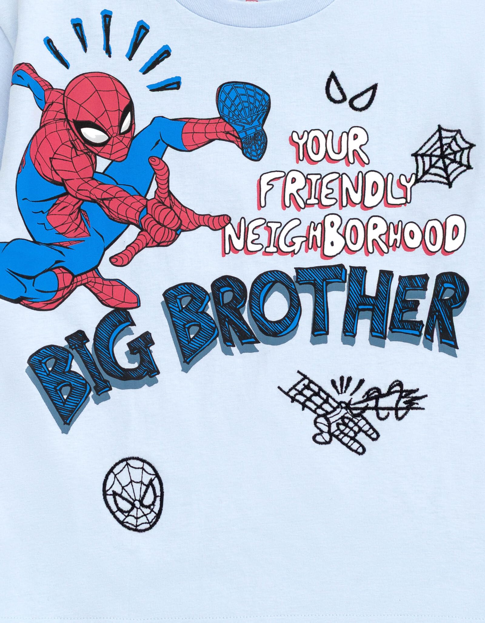 Rib knit crew neck collar; Awesome screen print design of Spiderman with the words "Your Friendly Neighborhood Big Brother"; Glossy hi-def gel print detailing and embroidered artwork; Stylish drop shoulder sleeves; Pull on closure