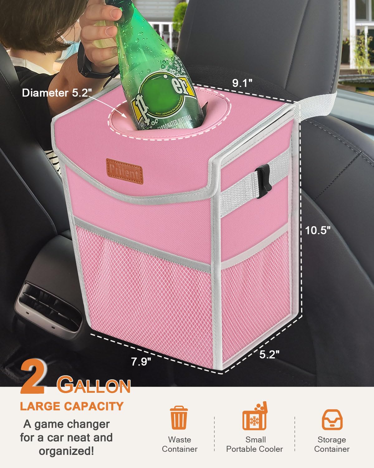3-in-1 Multipurpose Container With 2 gallon Capacity:A game changer for a car neat and organized! It is not only a rubbish holder and car storage organizer, but a nice portable cooler bag for your car. Mesh pockets provide convenient storage places for things like tissues, extra trash bags, and cleaning wipes. The mesh pockets can hold anything you want to keep within arm’s reach in your car. Why not upgrade your driving experience today and invest in a Pritent Trash can for your car?
