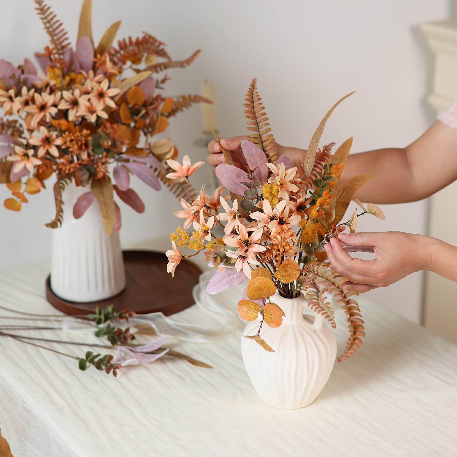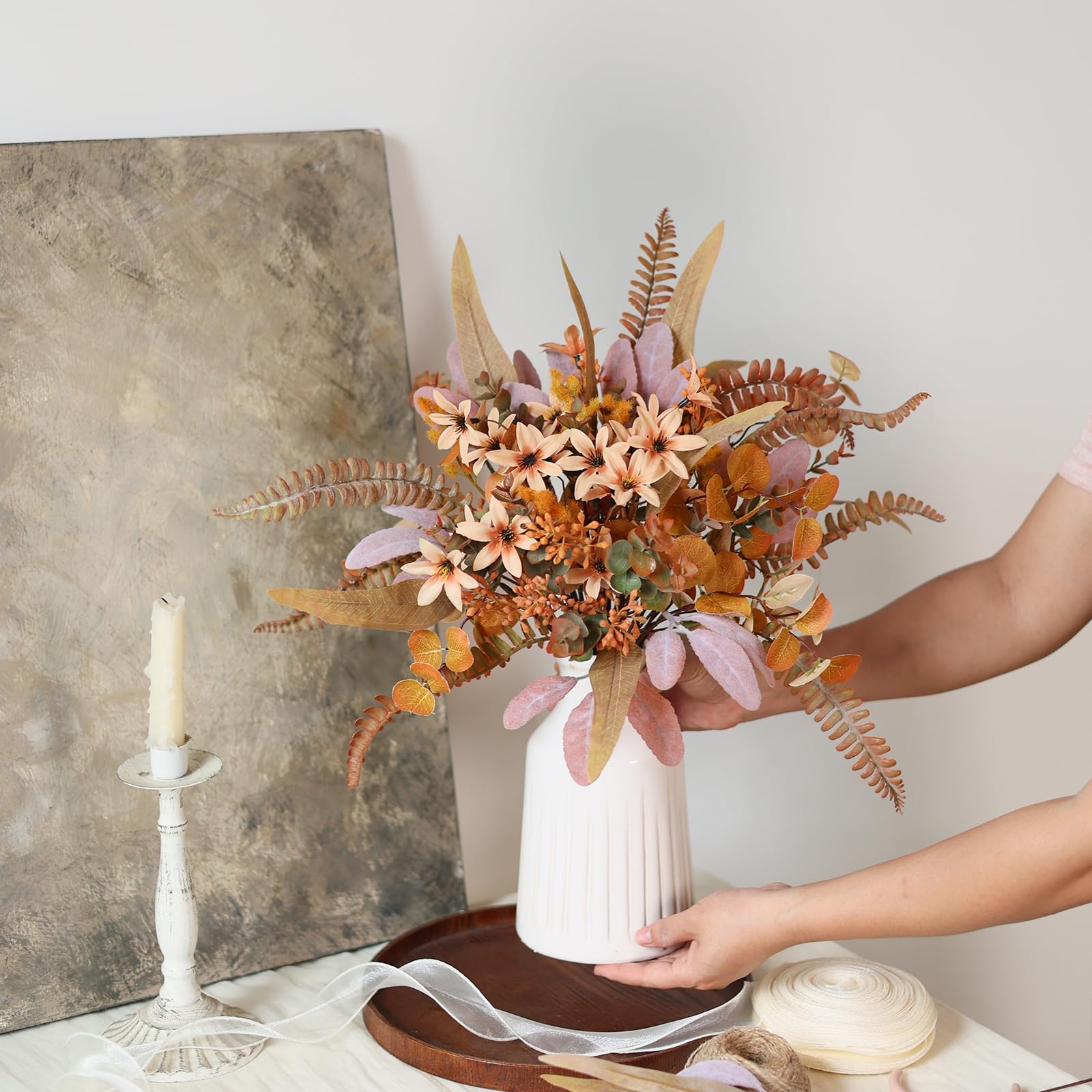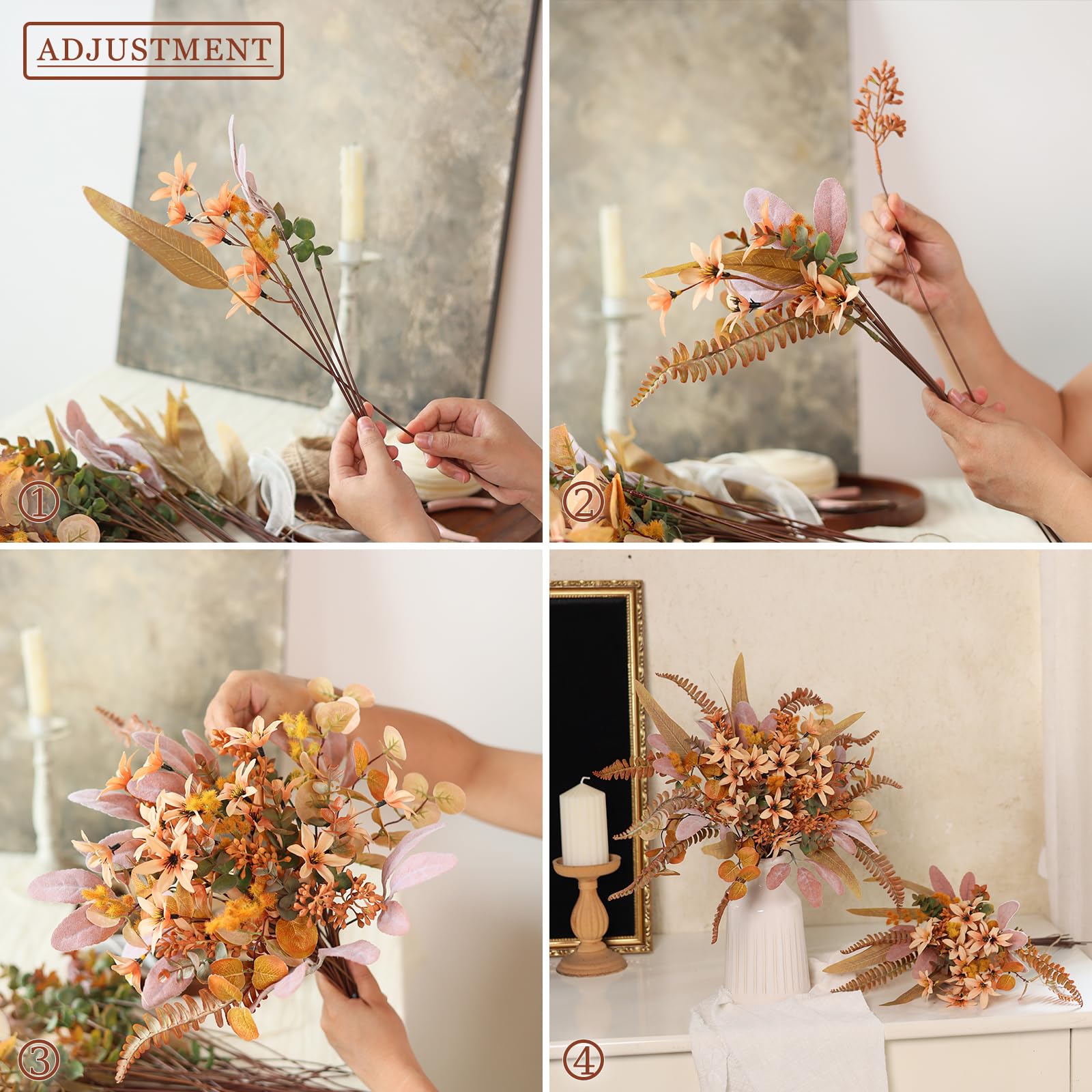 【Realistic appearance】: The gray-orange leaves are covered with flocking, and these leaves have been specially treated with a little white powder to add authenticity, making them look lifelike and very cute.This combination is not only a great filler for making bouquets, centerpieces, but can also make beautiful bouquets yourself.