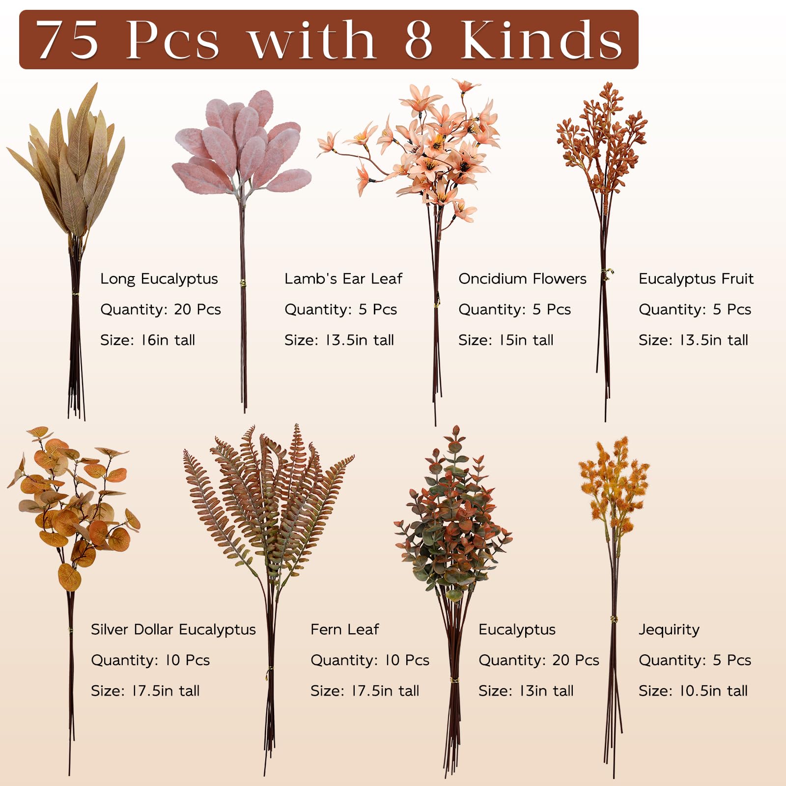 【Quantity and size】: 75 Pcs with 8 Kinds included: Eucalyptus(13") x20,Long Eucalyptus(16") x20, Fern Leaf(17.5") x10 ,Lamb's Ear Leaf(13.5") x5 ,Silver Dollar Eucalyptus(15")x5 ,Eucalyptus Fruit(13.5") x5,Jequirity(10.5") x5,Oncidium Flowers(17") x5.