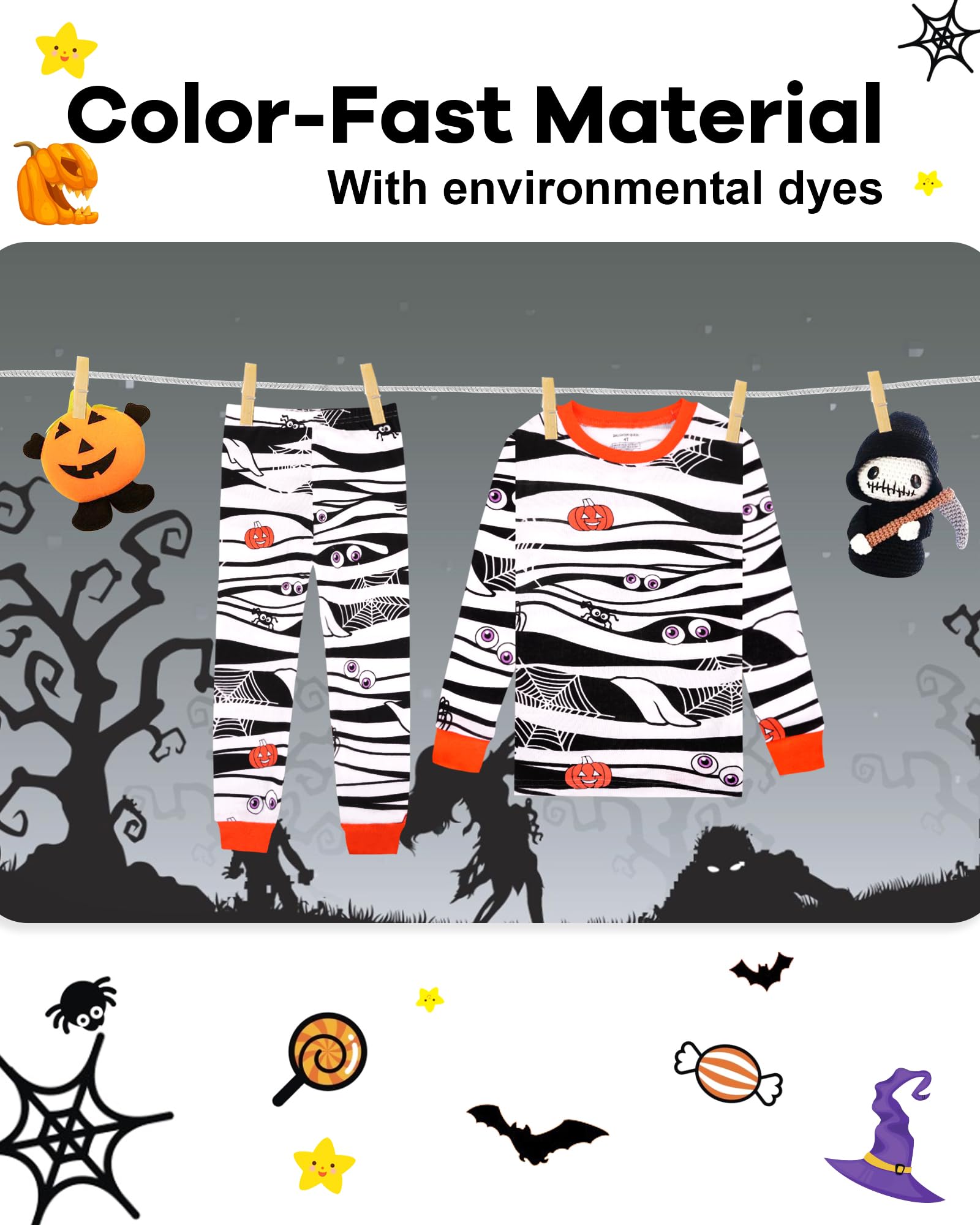 Safety: For kids' safety, our sleepwear is snug-fitting. And the T-Shirt pajamas sets are designed for the figure of most boys, including size 18-24M halloween kids pajamas, 2t halloween pajamas, 3t halloween pajamas, 4t halloween pajamas, size 5/5t halloween pajamas, size 6 pajamas, size 7 pajamas, size 8 pajamas, size 10 pajamas, size 12 pajamas. And we recommend checking the size chart carefully and sizing up if your little boy is a bit bigger than average