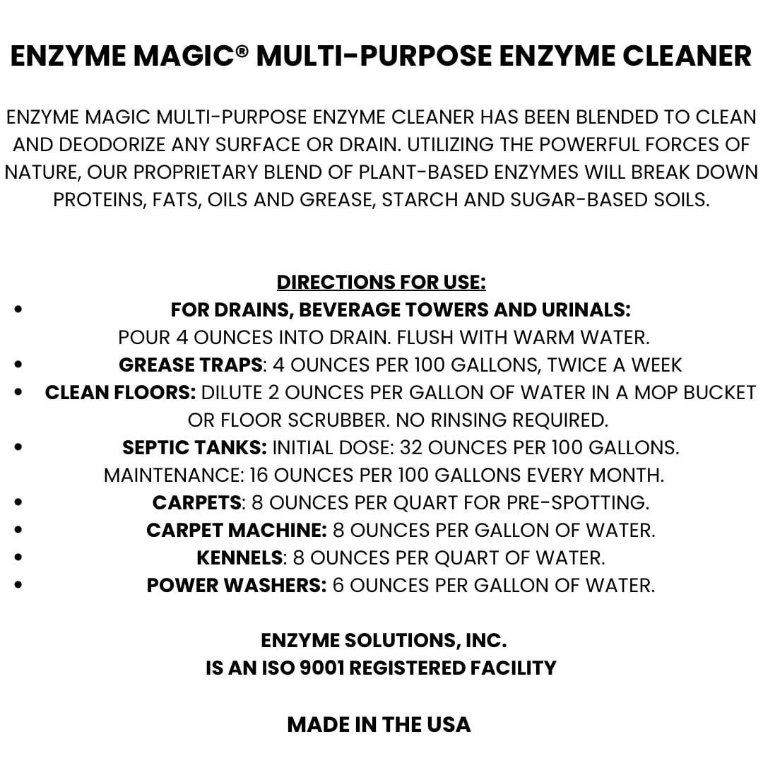 Use on any floor surface, home or commercial including greasy restaurant kitchens. Superior cleaner for carpets, furniture, hardwood, tile, drains, septic tanks and fields, litter boxes, garbage cans, RVs and more.
