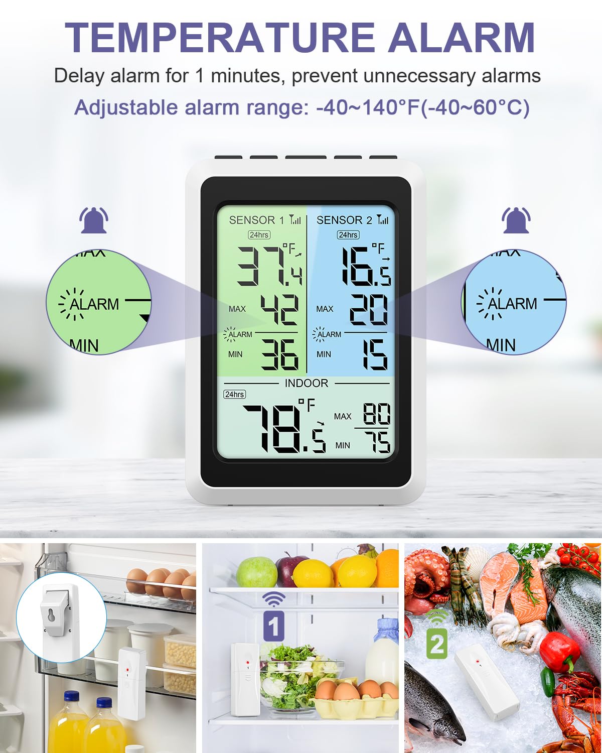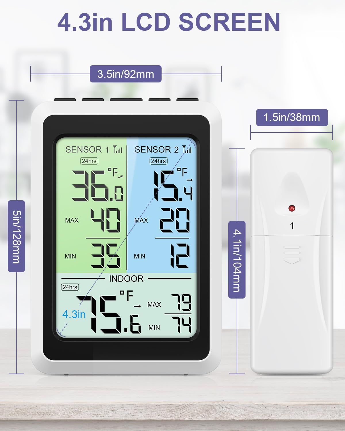 High Definition LCD Screen: This refrigerator thermometer is equipped with a 4.5-inch high-definition LCD screen, and the color screen can clearly display the temperature of two transmitters and the room. The measuring distance of the thermometer and transmitter is within 100 meters, which can receive well, making it a must-have for homes, restaurants, and wine cellars.