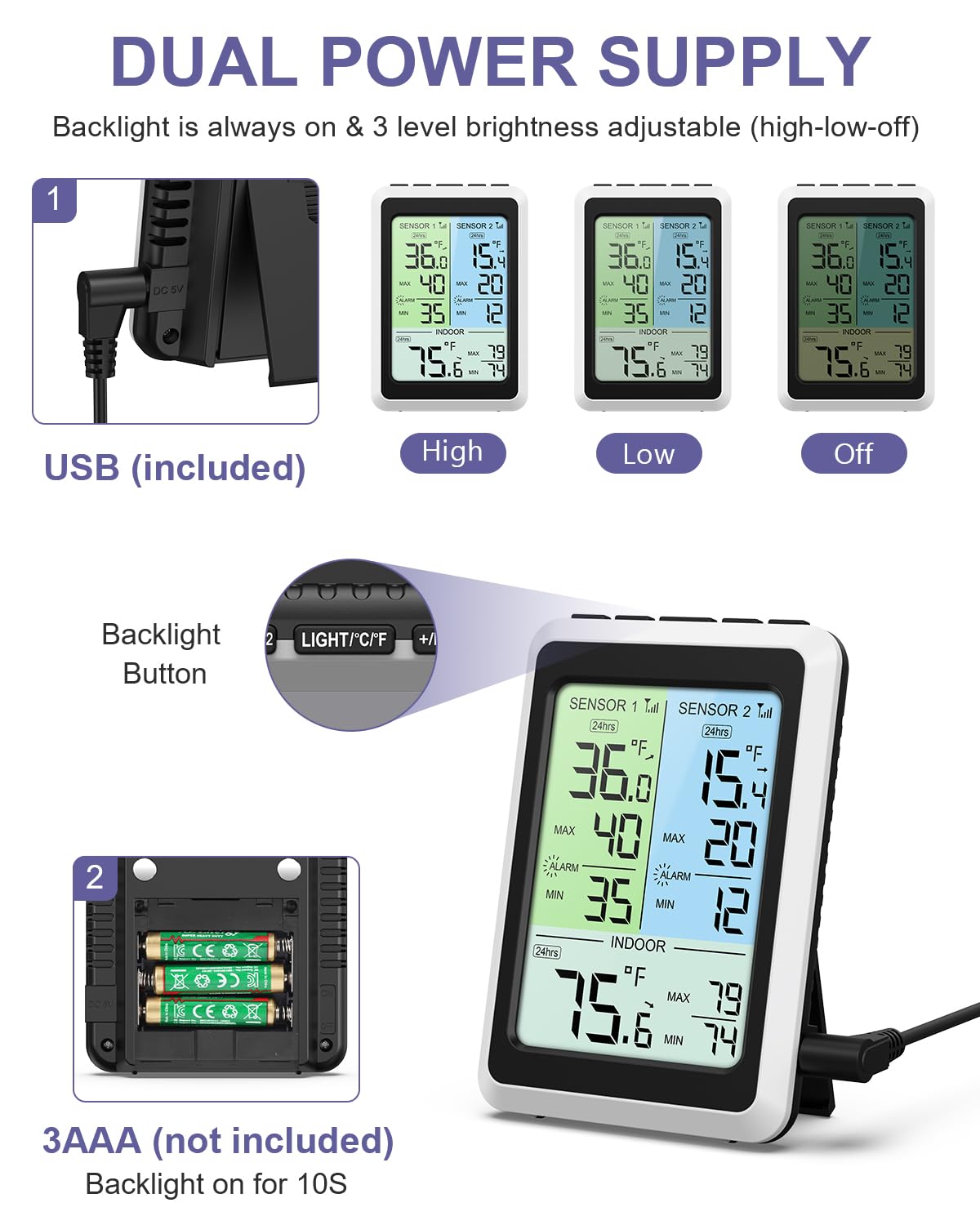 Battery & USB Powered: This unique digital refrigerator thermometer features backlight function, making it easy to check temperature in low light environments. When powered by batteries (not including batteries), the screen will light up in color and turn off after 10 seconds when the backlight button is touched; When using a USB power supply, there are 2 levels (high-low) of adjustable backlight brightness, and you can choose the appropriate brightness.
