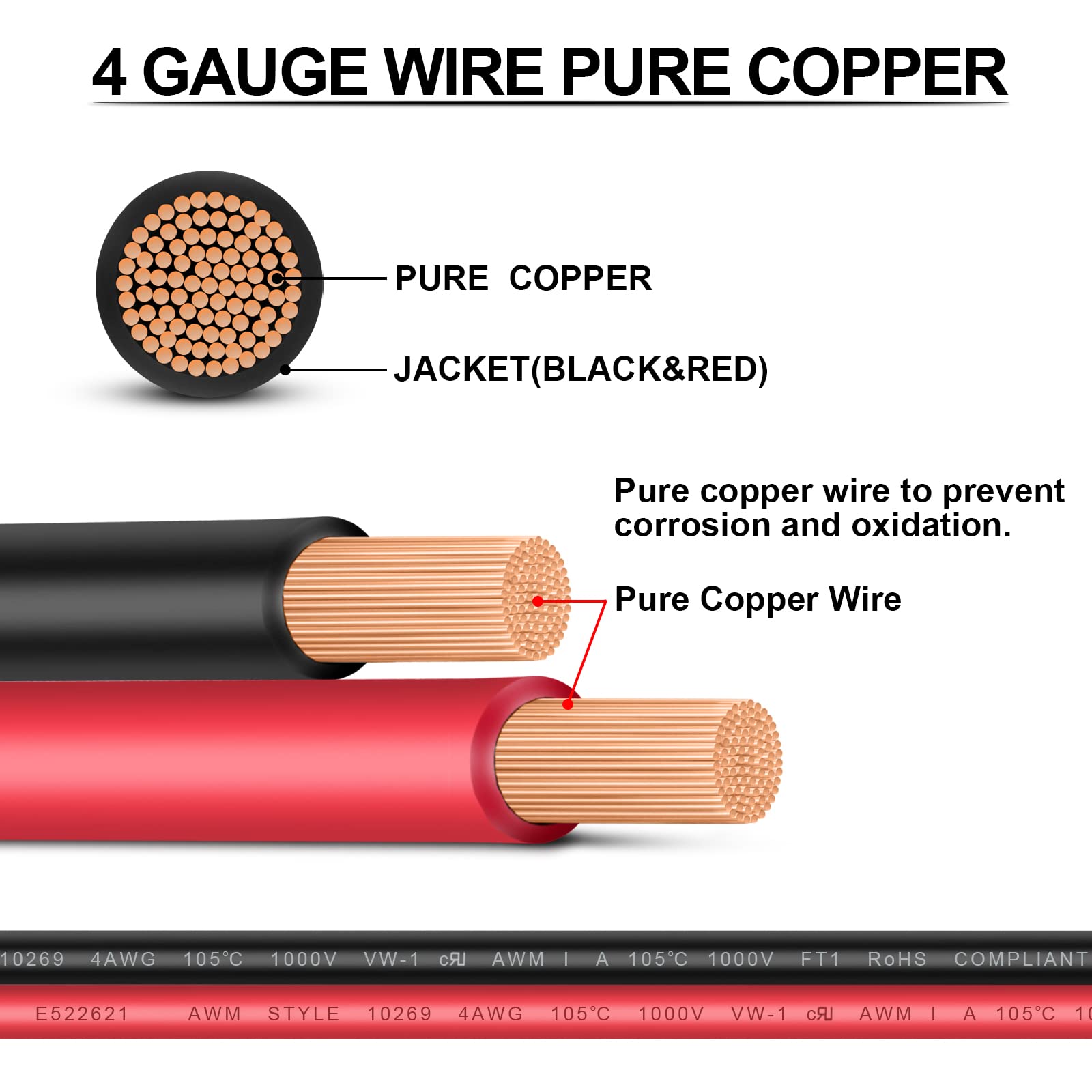 The battery cable is built with a massive core of 100% Pure Copper for power, wrapped in Ultra-Soft PVC for flexibility, made of heavy duty 4 gauge wire, very thick and durable.