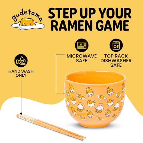 STEP UP YOUR RAMEN GAME: 20 oz ramen bowl comes with a pair of matching Gudetama chopsticks. Enjoy ramen, rice, soups, and more in this playful kawaii dish.
