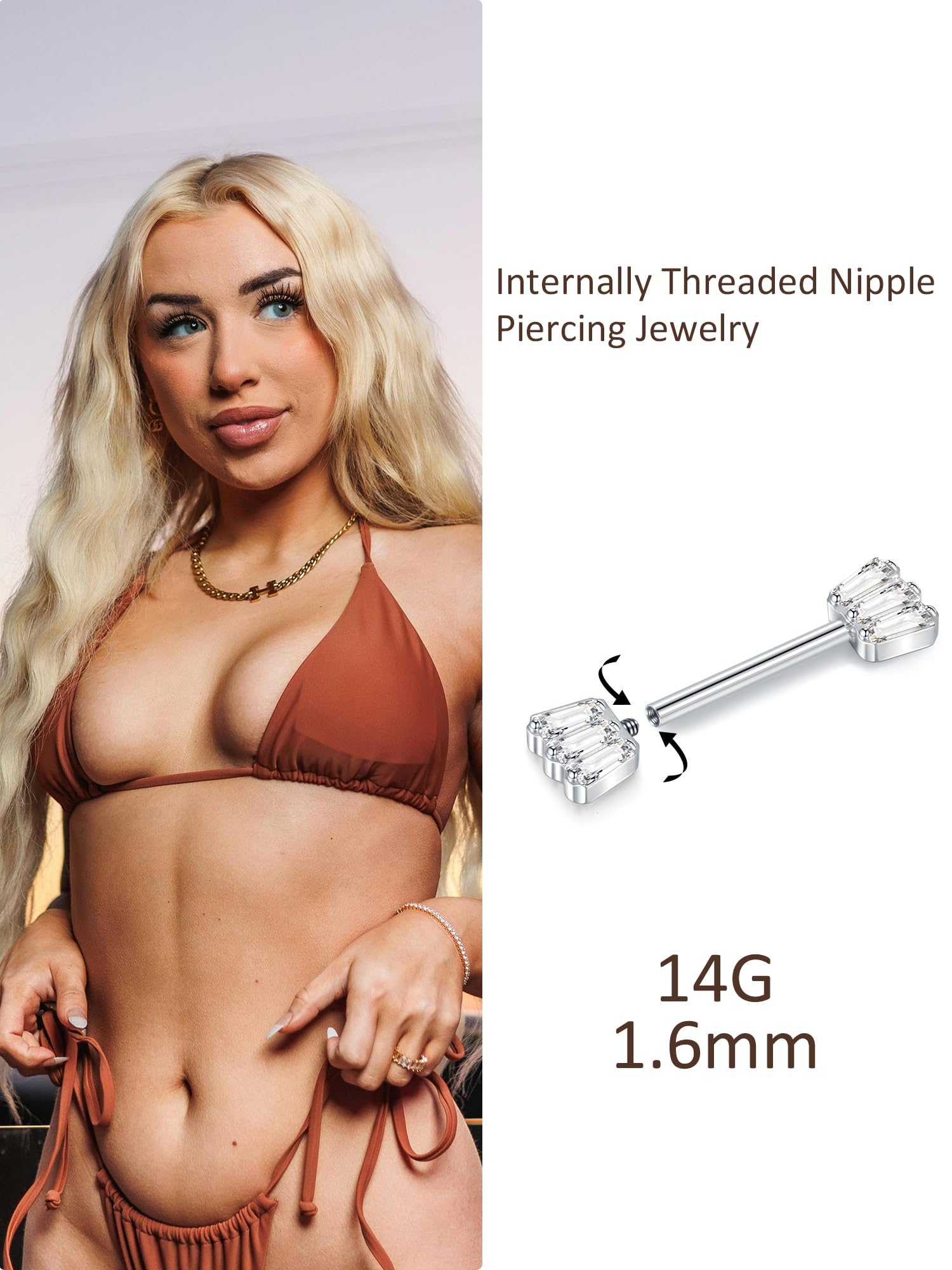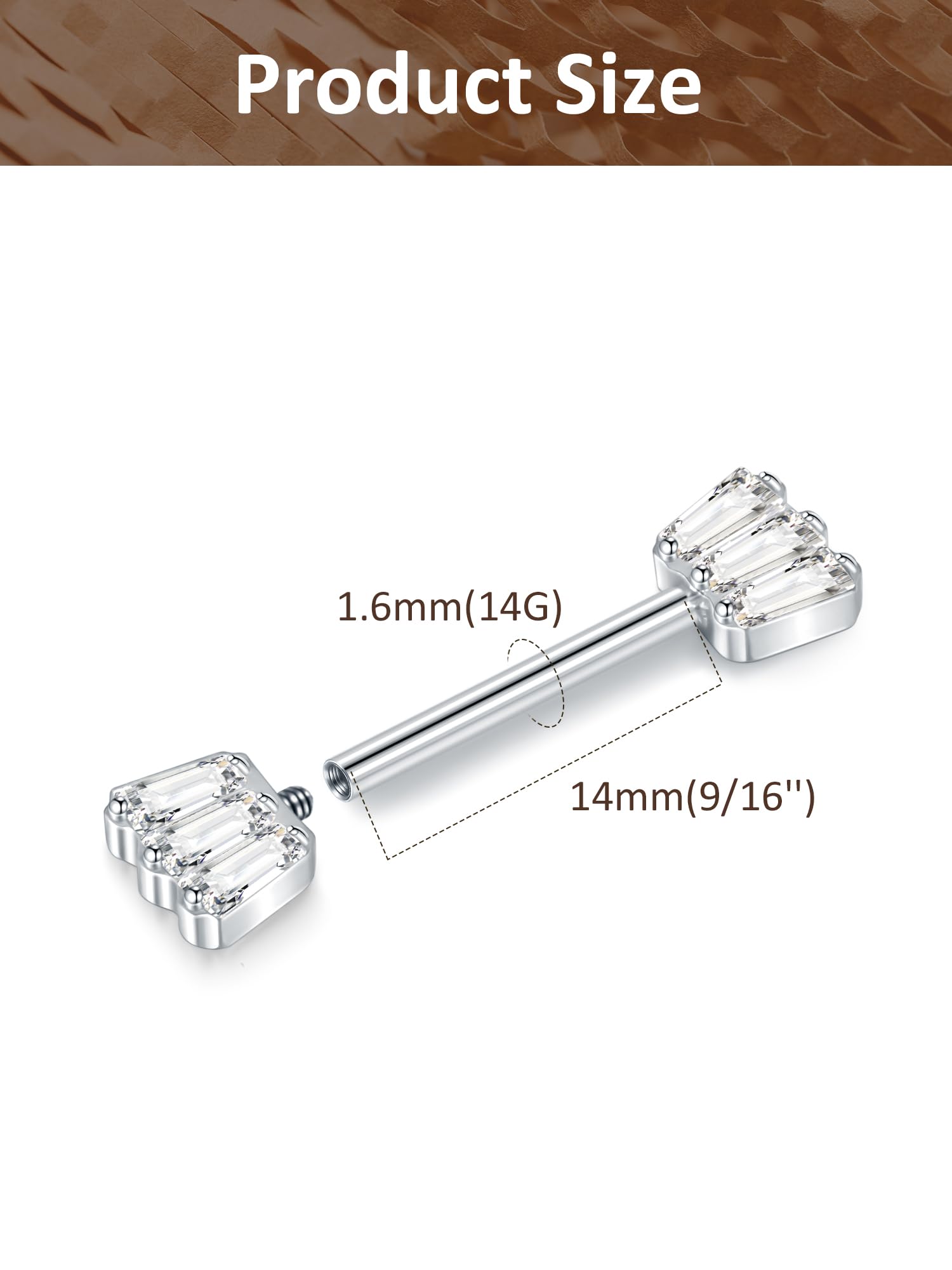 14g Nipple Barbells: Bar Thickness: 1.6mm, bar length : 14mm. Please feel free to contact us by email if you need any assistance on choosing the right size for your nipple piercings