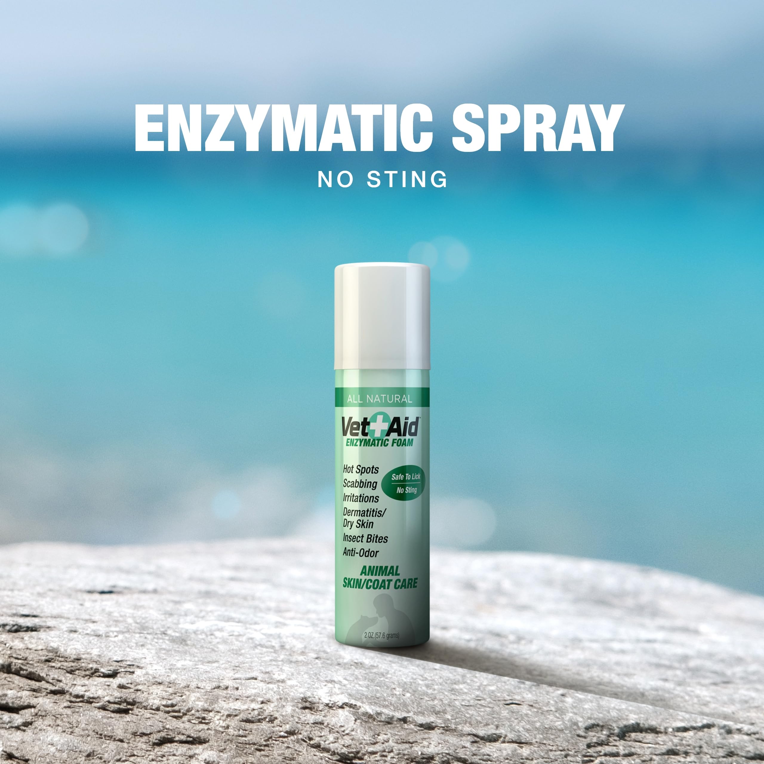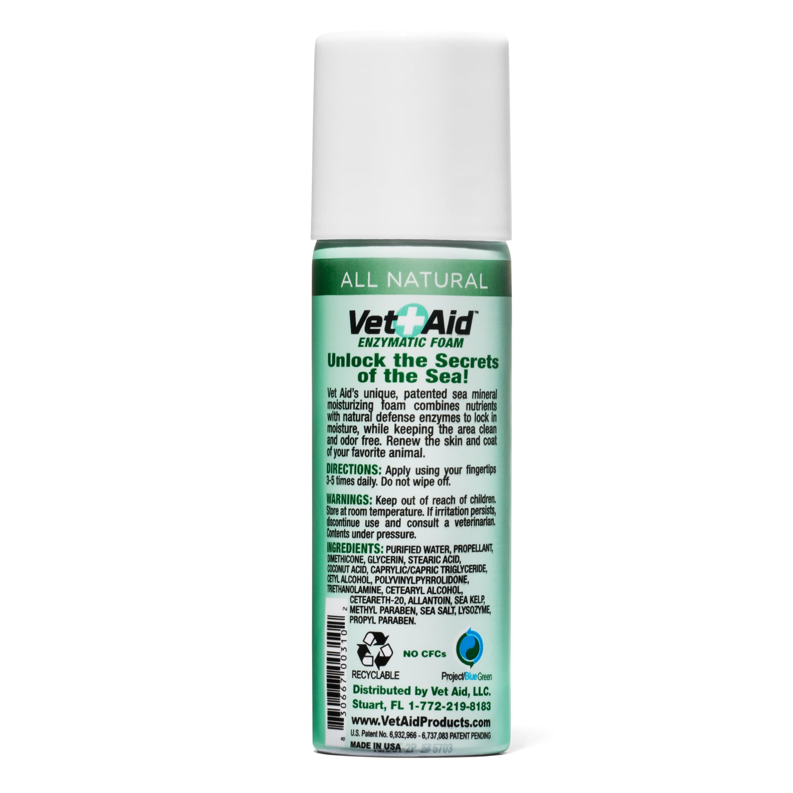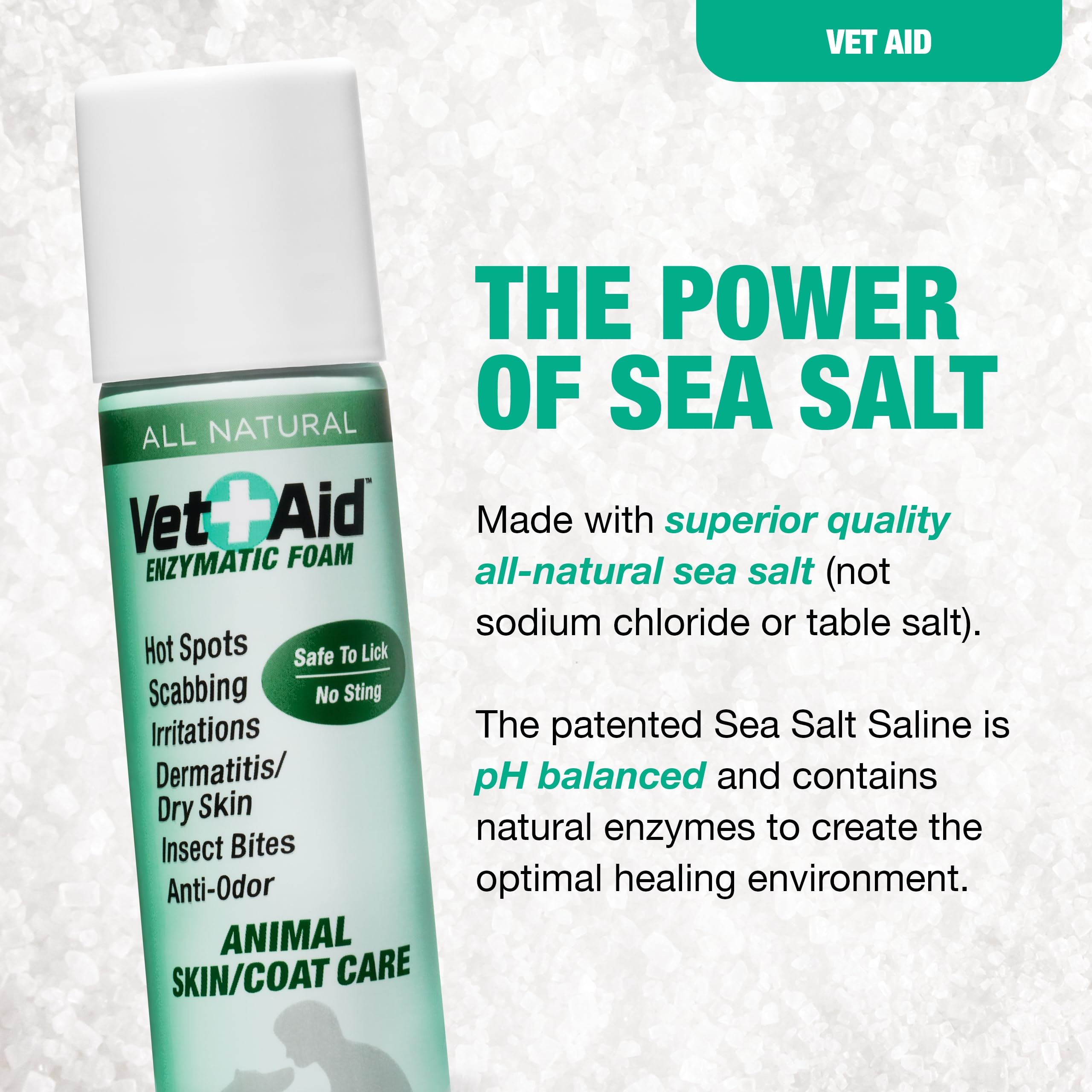 Vet Aids patented All Natural Sea Salt Wound Care Foam is revolutionizing the way small and large animal wounds are cared for topically. This chemical-free moisturizing foam solution acts as a liquid bandage. It contains USP Grade Sea Salt and Enzymes essential in healing a variety of dermatological conditions. Vet Aid Wound Care products can be used safely on all animals, regardless of age or size. Ideal uses include: Insect bites, dry dermatitis hair/skin conditioning, hot spots, thrush, pyoderma, sunburn, non secreting wounds, acne and skin rash.
