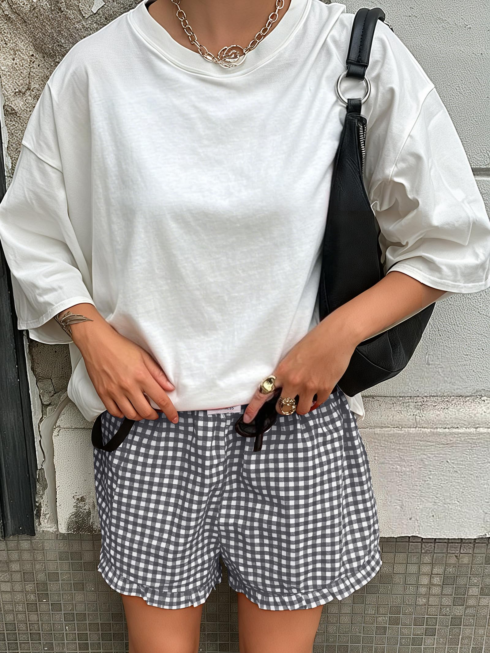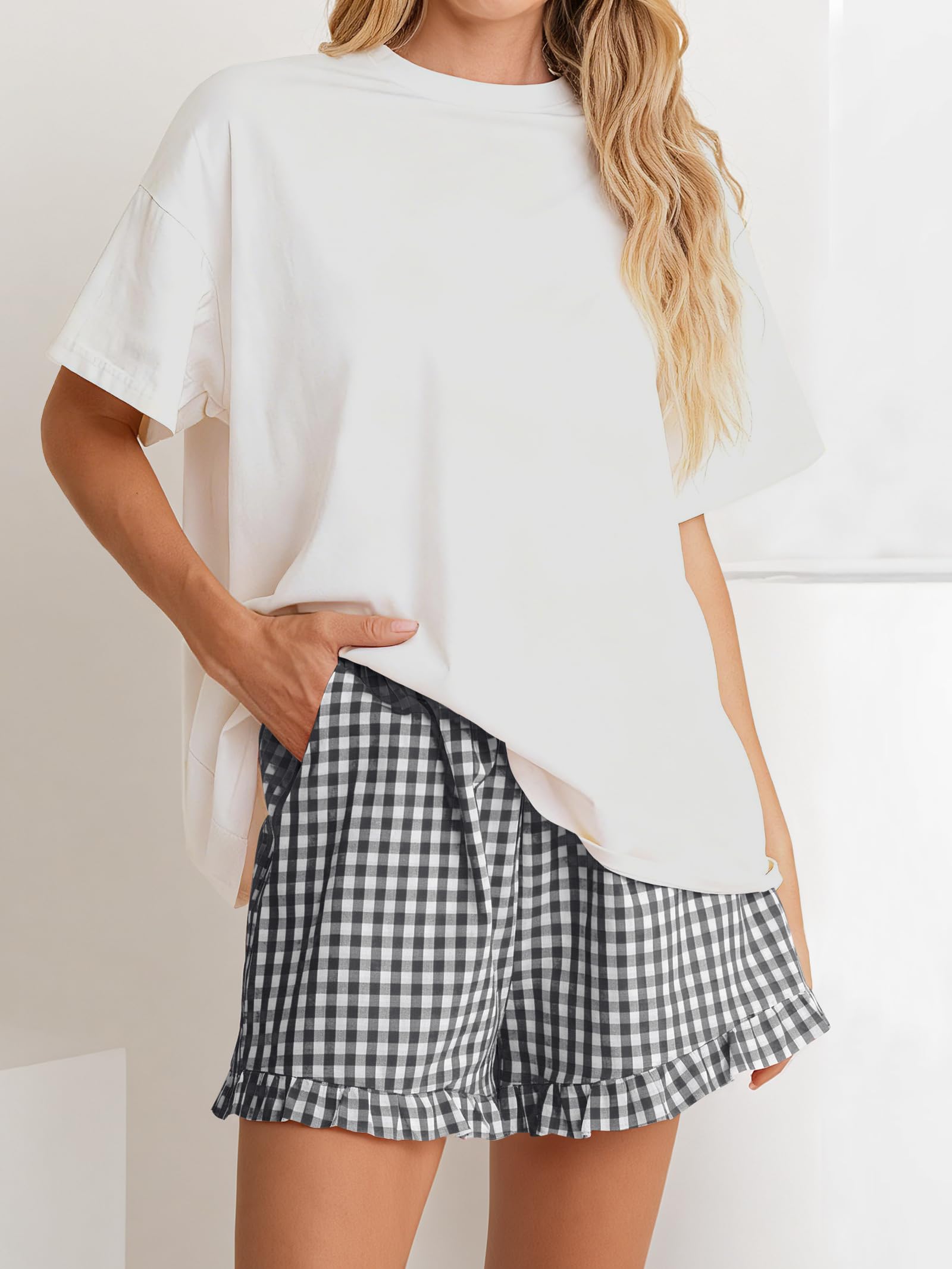 Fit Type - Loose Fit. ruffle shorts, boxer shorts for women, pajama shorts women, gingham shorts womens, plaid shorts, shorts for women, checkered shorts women, boxers for women, plaid boxer shorts for women, lounge shorts, sleep shorts women , summer shorts for women, pj shorts, womens bottoms
