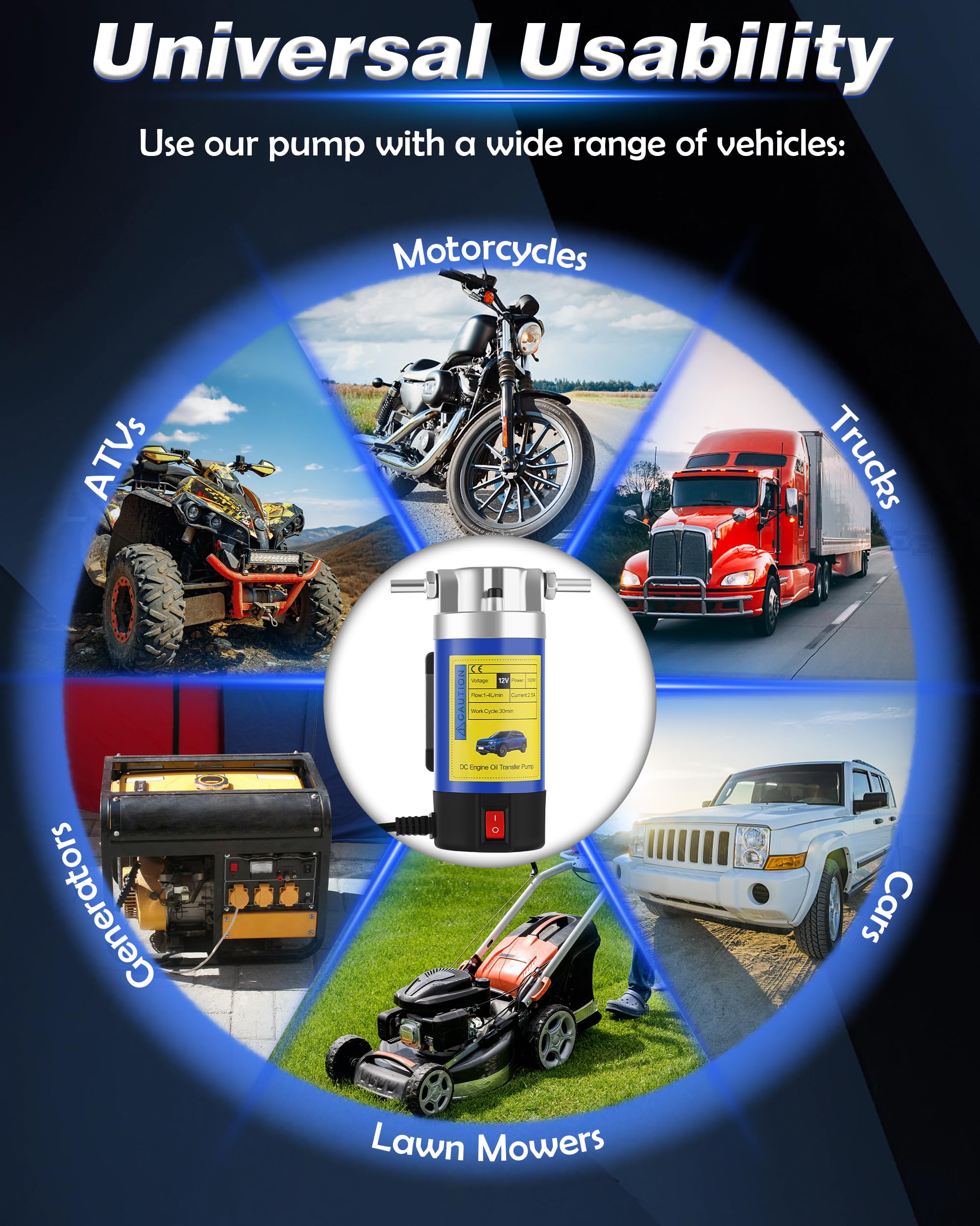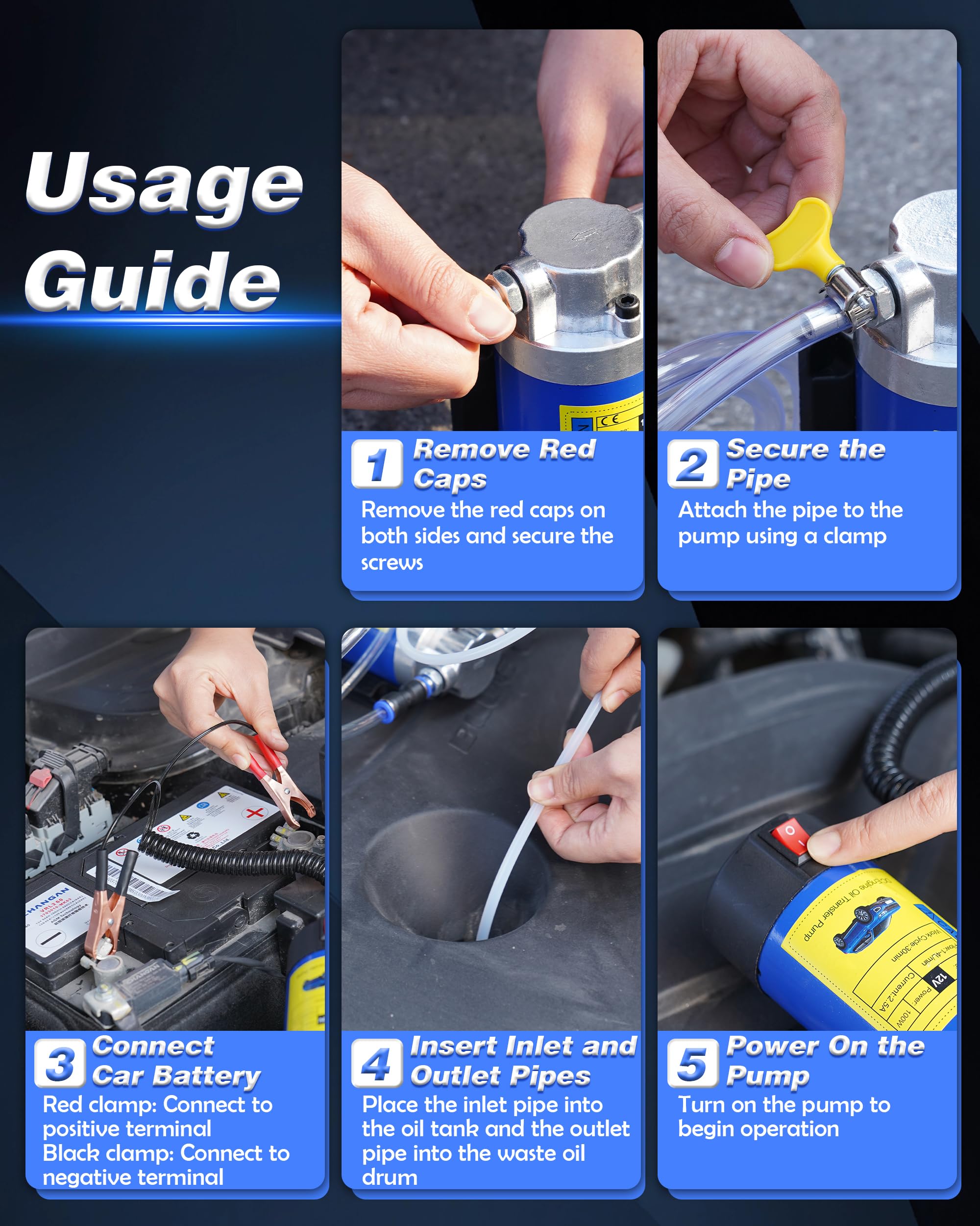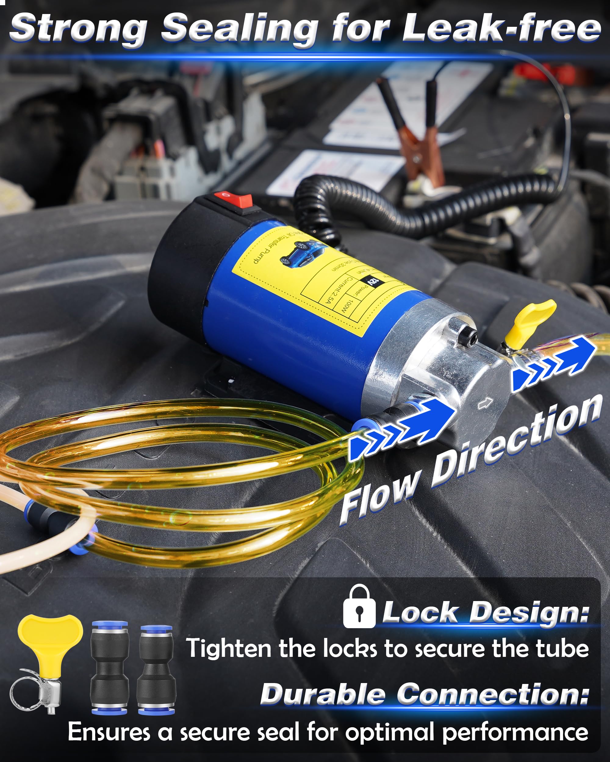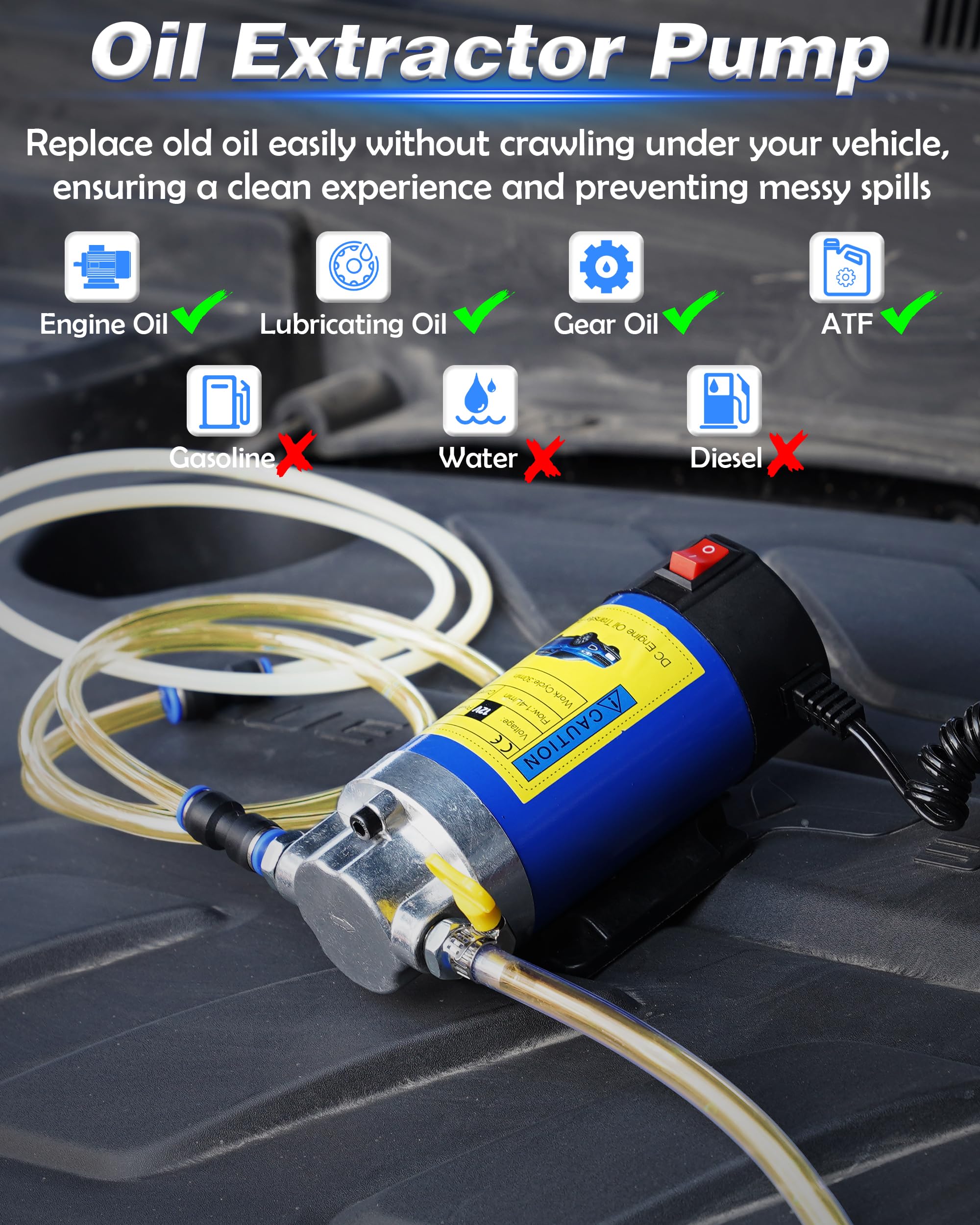 Efficient Oil Extractor: Featuring a Pure Copper Motor that ensures fast and stable suction rates. For even quicker extraction, warm up the engine on the highway before use. And use a filter when pumping oil with impurities.