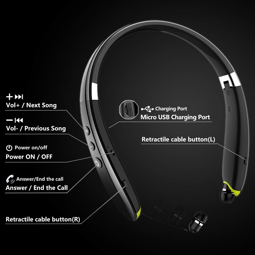 【Ergonomic Neckband & Retractable Earbuds】Ergonomic neckband design, you can wear the headphones on your neck comfort. Retractable Earbuds- a unique design for cable management, no more tangled wire obsession allows you to pull the retractable wire to the length you want and retract when not use.