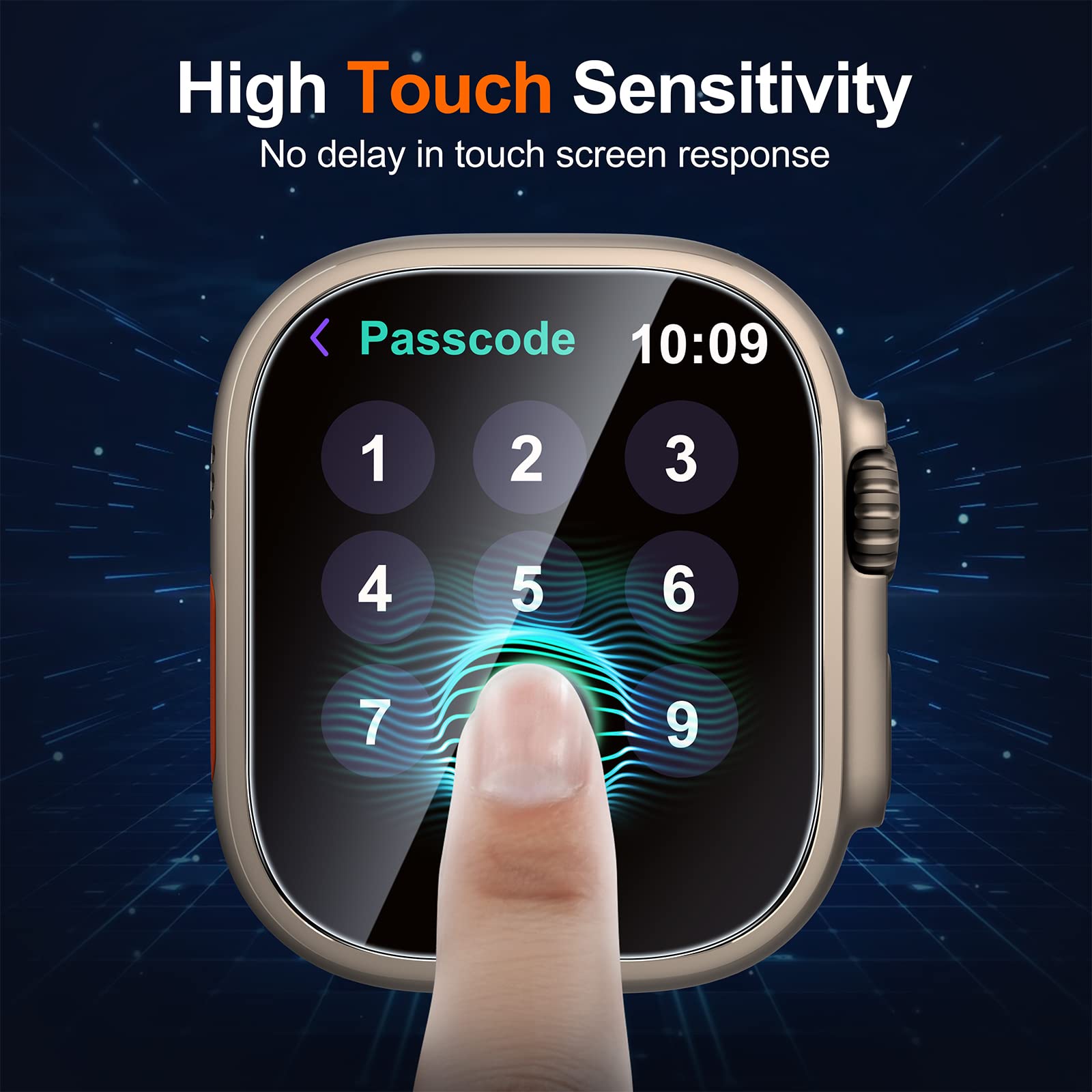 HD Clear and Touch Sensitive: 0.02mm ultra-thin HD clear Apple Watch Ultra glass screen protector film gives the massive clearness as the watch's original screen, it fits your Apple Watch Ultra / Ultra 2 /Ultra 3 screen perfectly you won't even notice it. Ultimate touchscreen sensitivity enhances your usability experience as your fingers glide more smoothly on these screen guards.