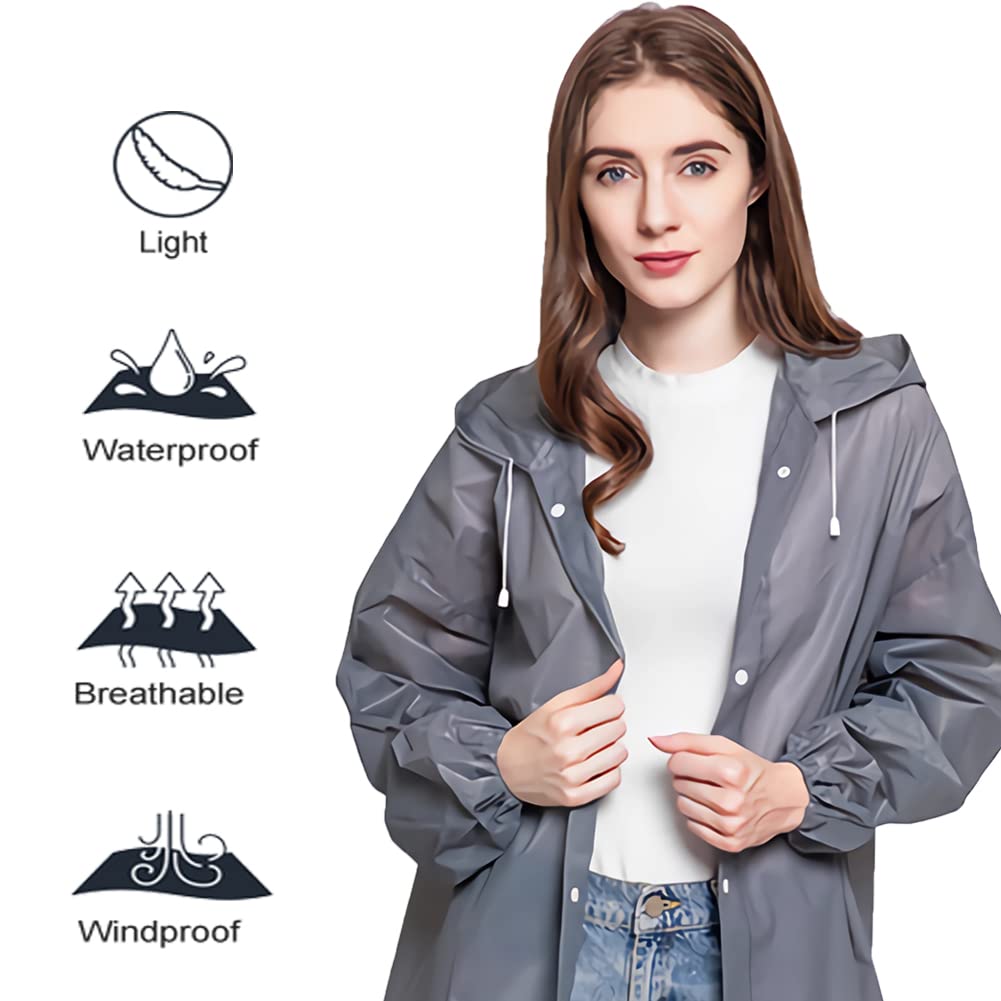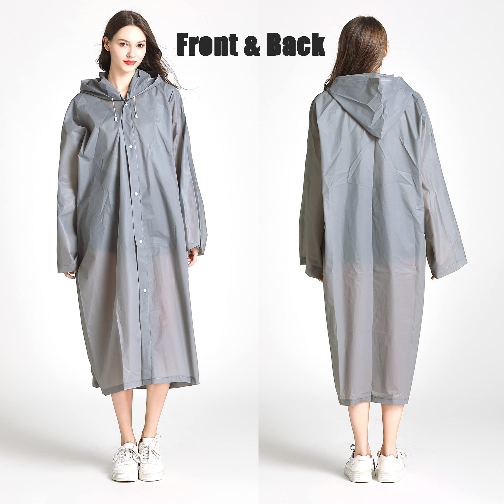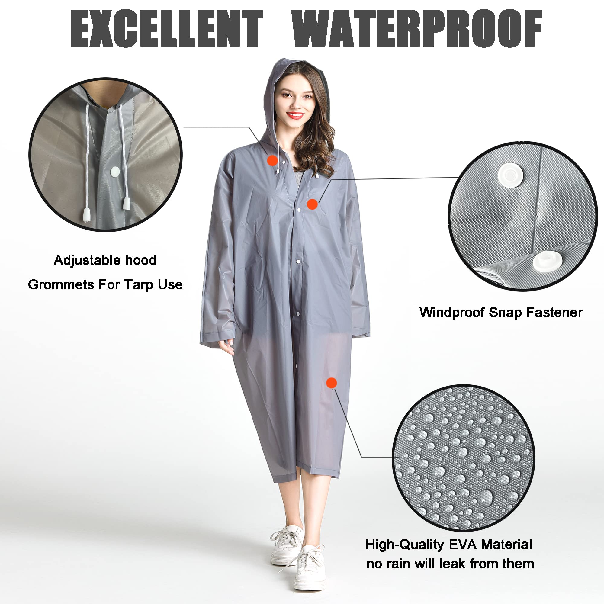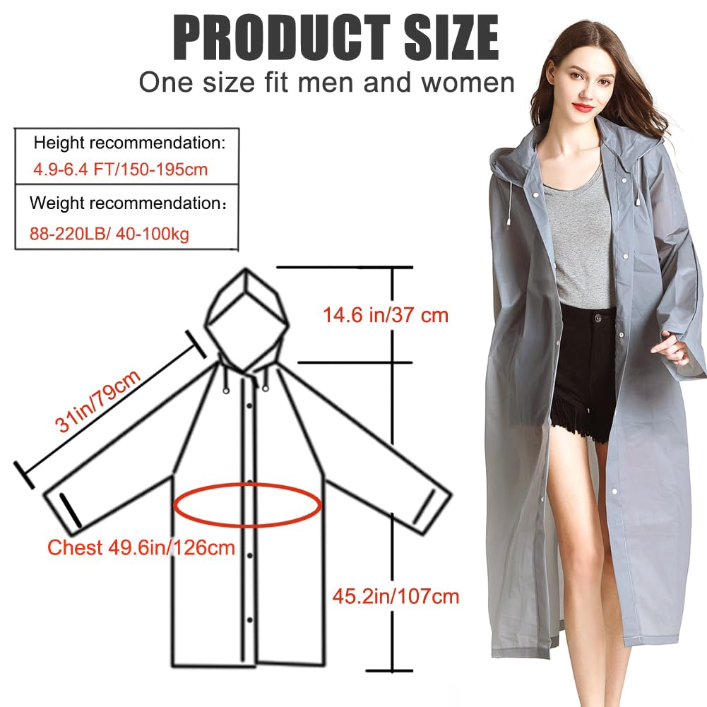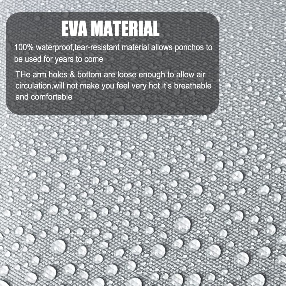 *SAFE & HIGH-QUALITY RAINCOAT: Made of 100% EVA, an environmentally friendly material, the rain poncho is non-toxic, no smell, and is harmless. Extremely waterproof and lightweight, the long sleeves and big drawstring hood design will keep your arms, head, and neck dry.