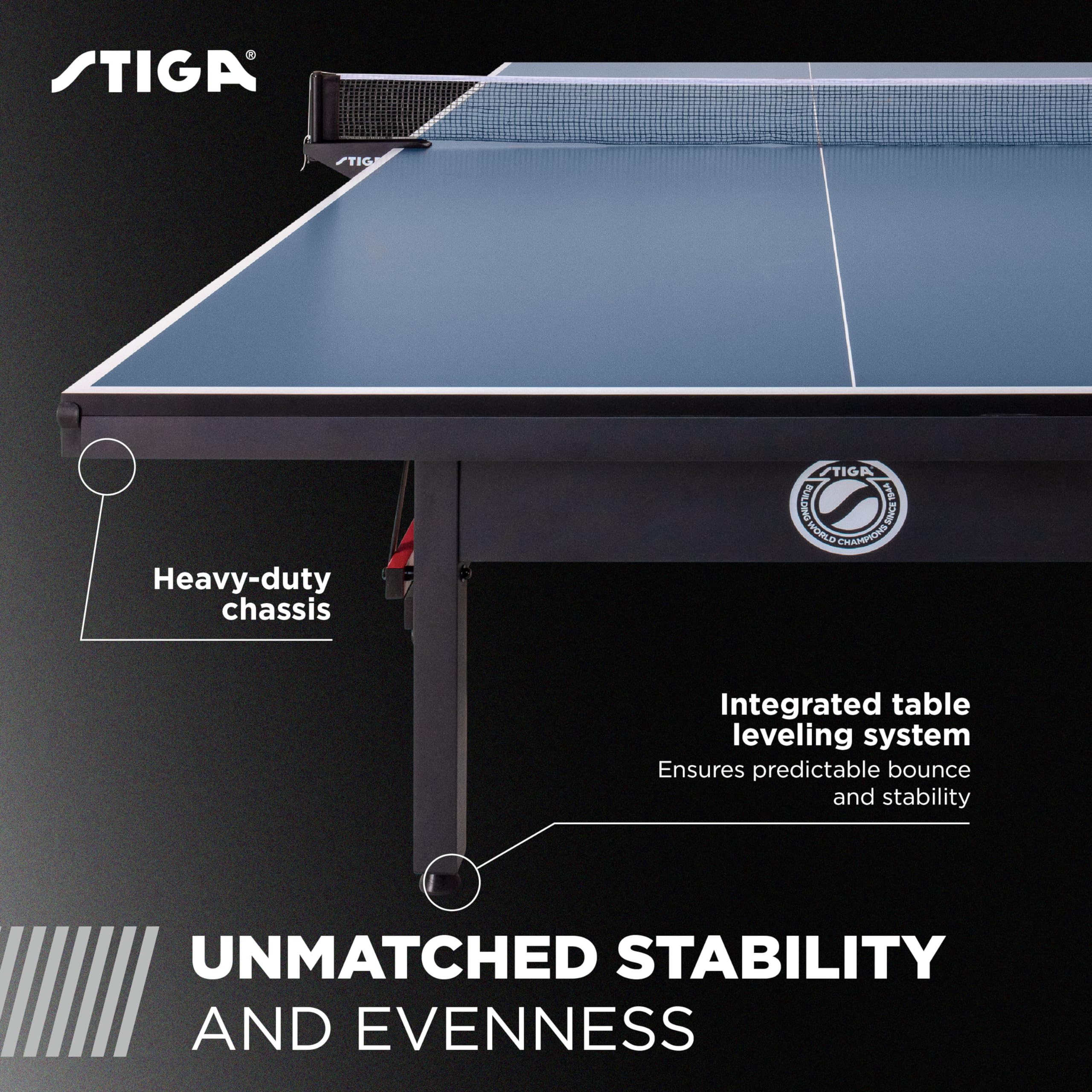 UNMATCHED STABILITY AND EVENNESS: Immerse yourself in the tournament-style atmosphere with a UV repeat roller coat top finish and heavy-duty chassis design featuring an integrated table leveling system. This combination guarantees unparalleled evenness and stability, ensuring the ball bounces predictably, allowing players to anticipate and react accordingly.