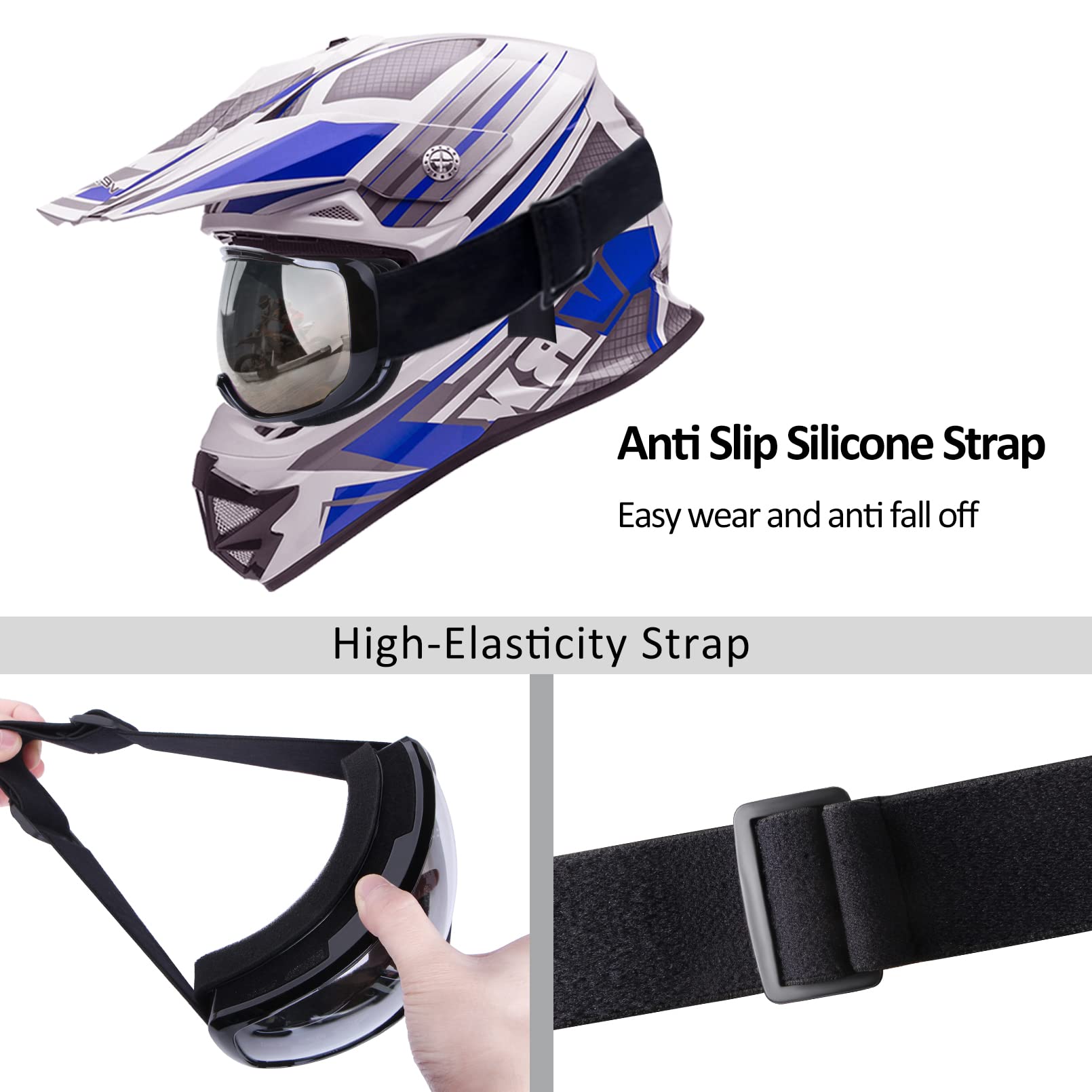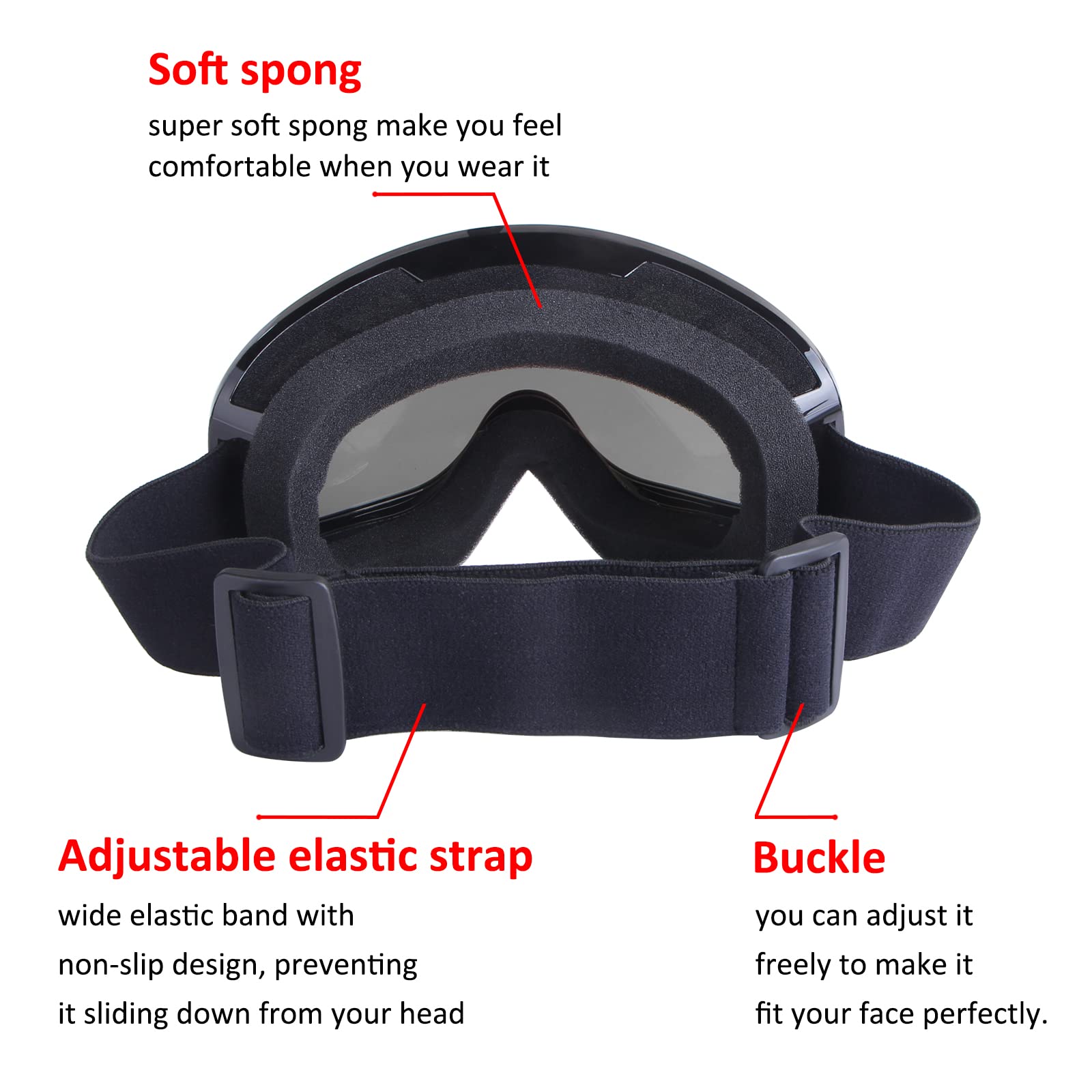 Anti-Fog snowmobile snowboard skate ski goggles have good ventilation and adjustable elastic straps. Also, these motocross goggles are ideal for half of the open-face helmets, and also fit Car enthusiasts or hot air balloonists.