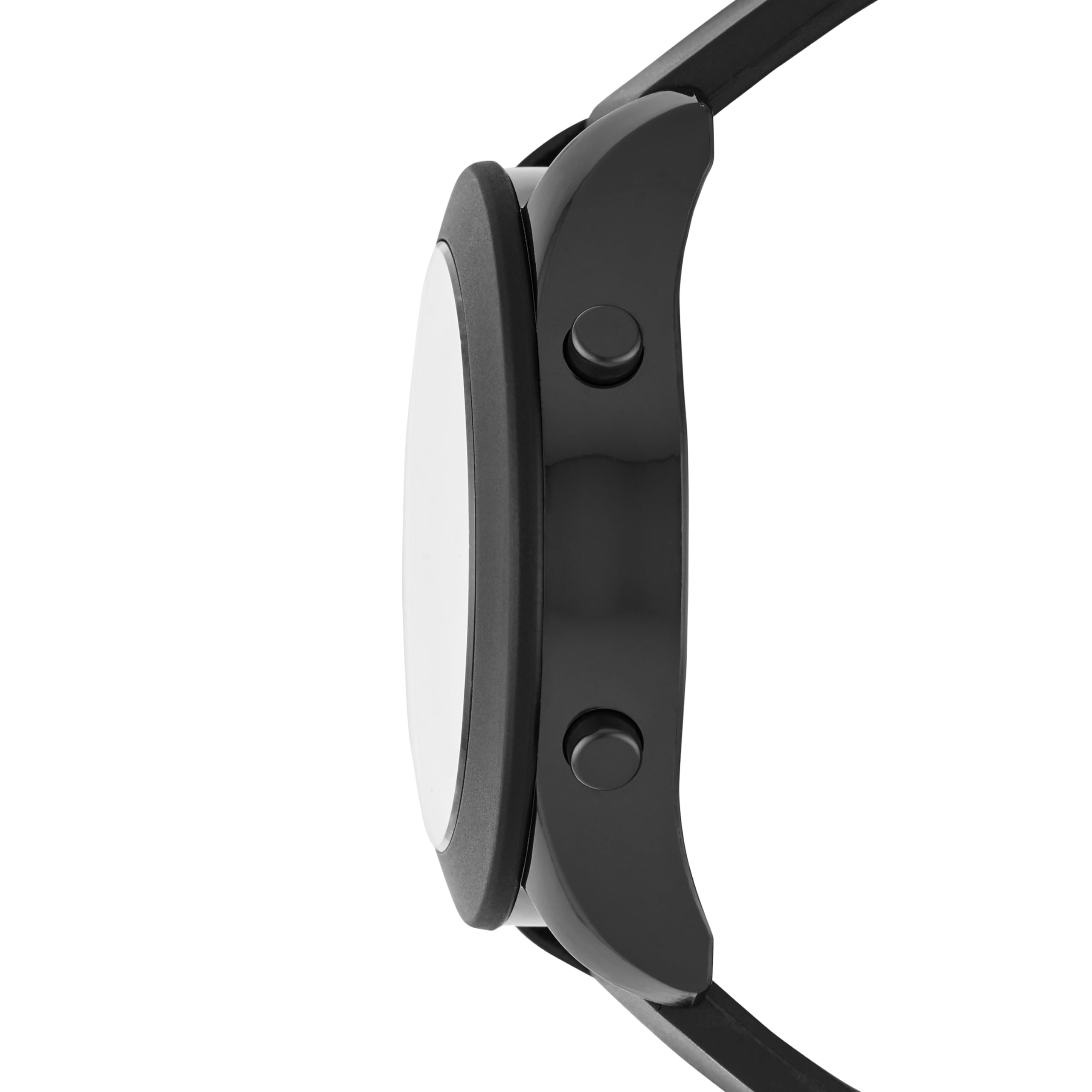 Round polycarbonate case with black dial; black silicone band