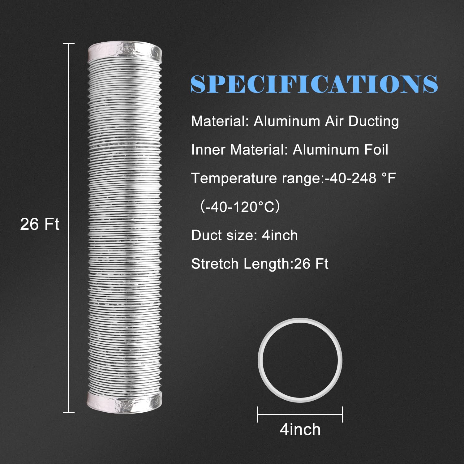 DUCTING PARAMETERS : 4" in diameter, This dryer duct is 26 feet long when fully extended, and the ducting can bend freely. Thermal endurance ranges from -40 to 248 F (-40 to 120 C)