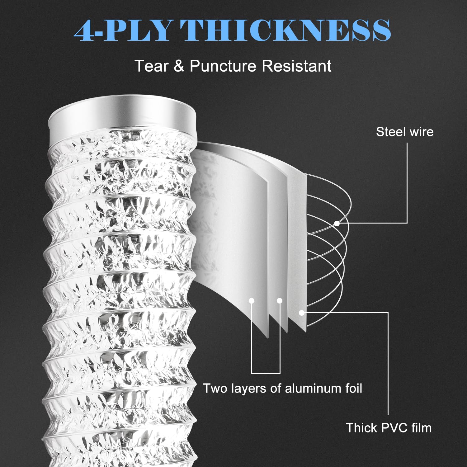 ADVANCED FOUR LAYER : Under the PVC layer the dryer duct hose is built with 2 layers of aluminum foil. A layer of durable PET and steel wire helix to preserve the shape, keep your ventilation system free of rips and pin holes.This dryer exhaust hose adopts a thickened design process, and the airflow circulates well inside, which can effectively prevent excessive noise. Provide you with a comfortable usage environment