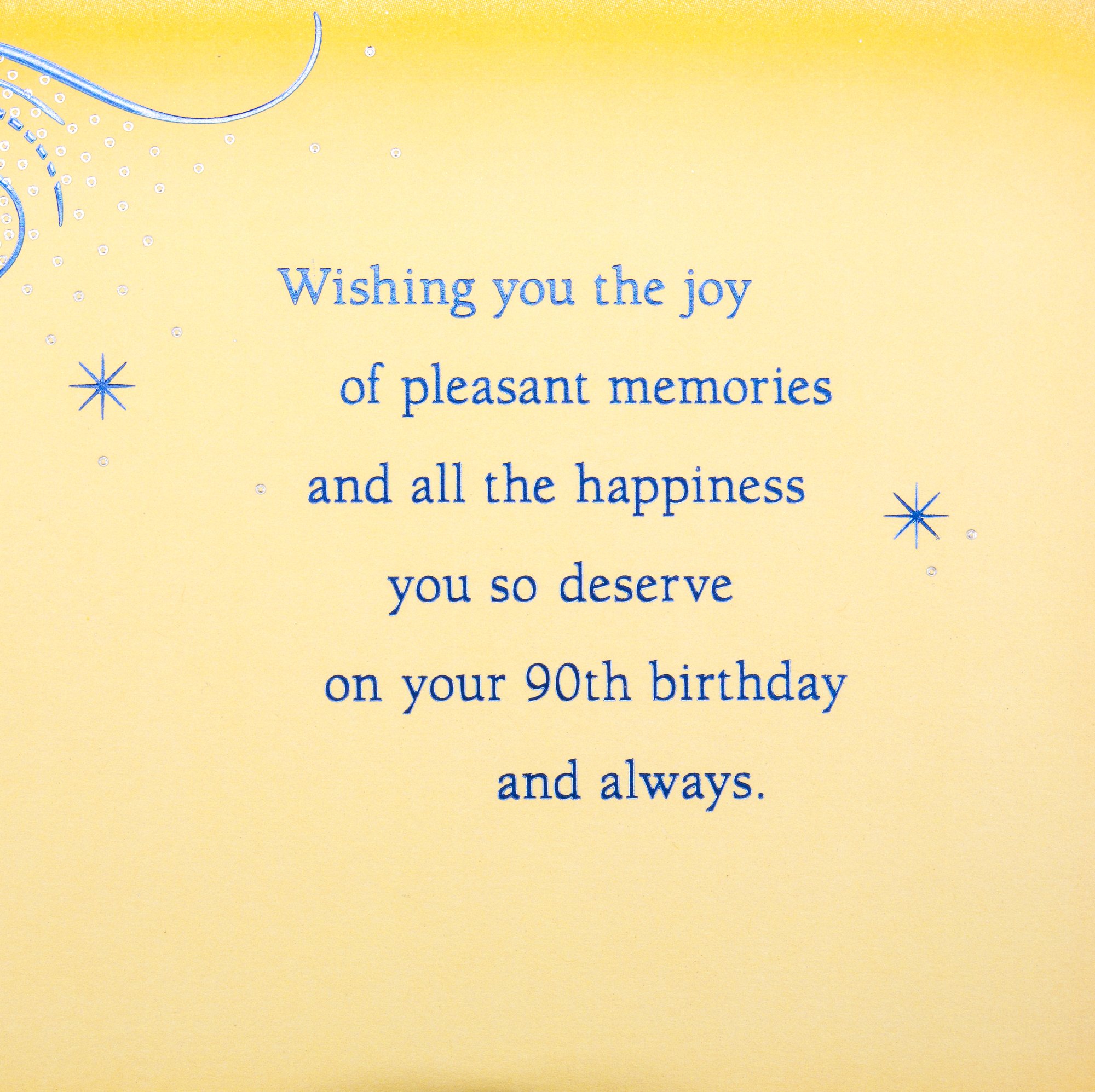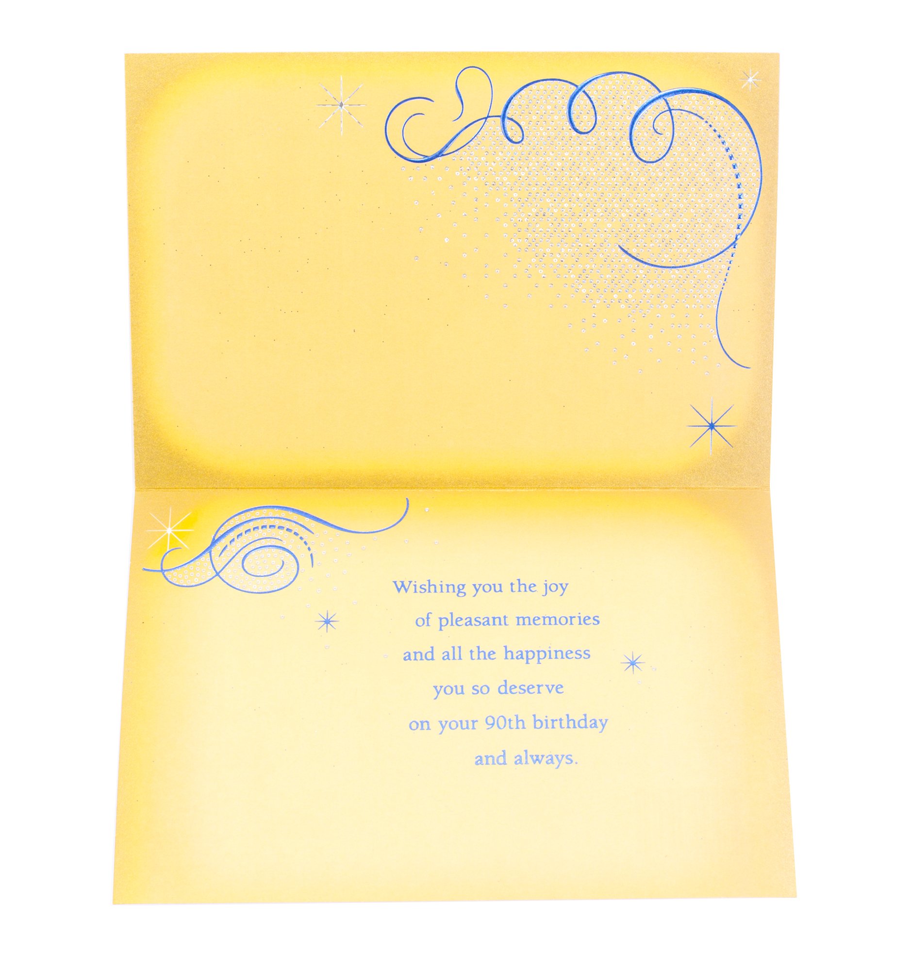 Cover features an embossed blue circle with the number 90, accented with blue scrollwork, and reads: "Happy birthday." Inside reads: "Wishing you the joy of pleasant memories and all the happiness you so deserve on your 90th birthday and always."