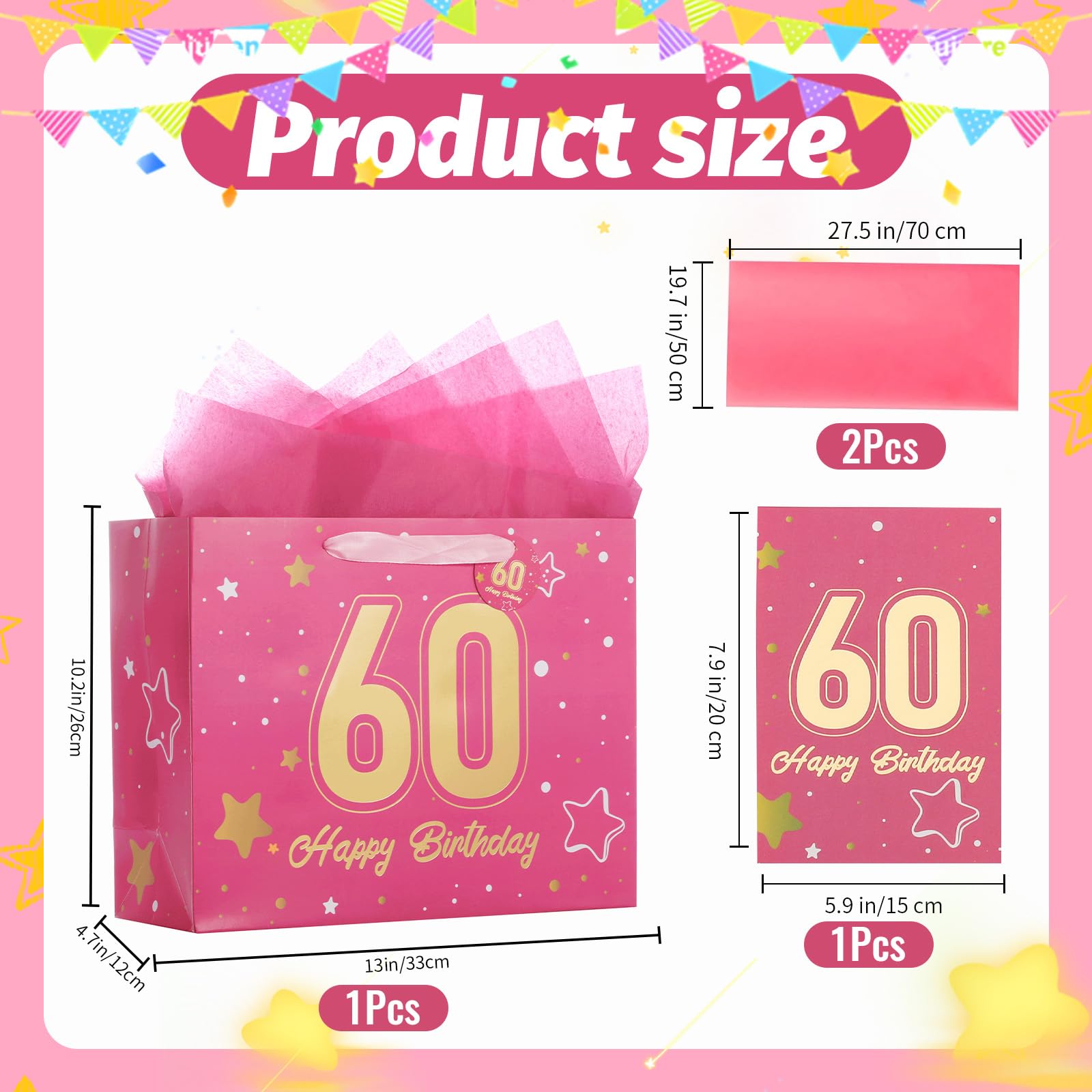 【60th Birthday Gift Bag】This 60th birthday gift bag set includes matching tissue paper, a greeting card, and tags. The decorative ribbon handles add a festive touch. It simplifies gift wrapping for a hassle-free experience. The gift bag measures 13" W x 10.2" H x 4.7" L; the card measures 7.9" W x 5.9" H.