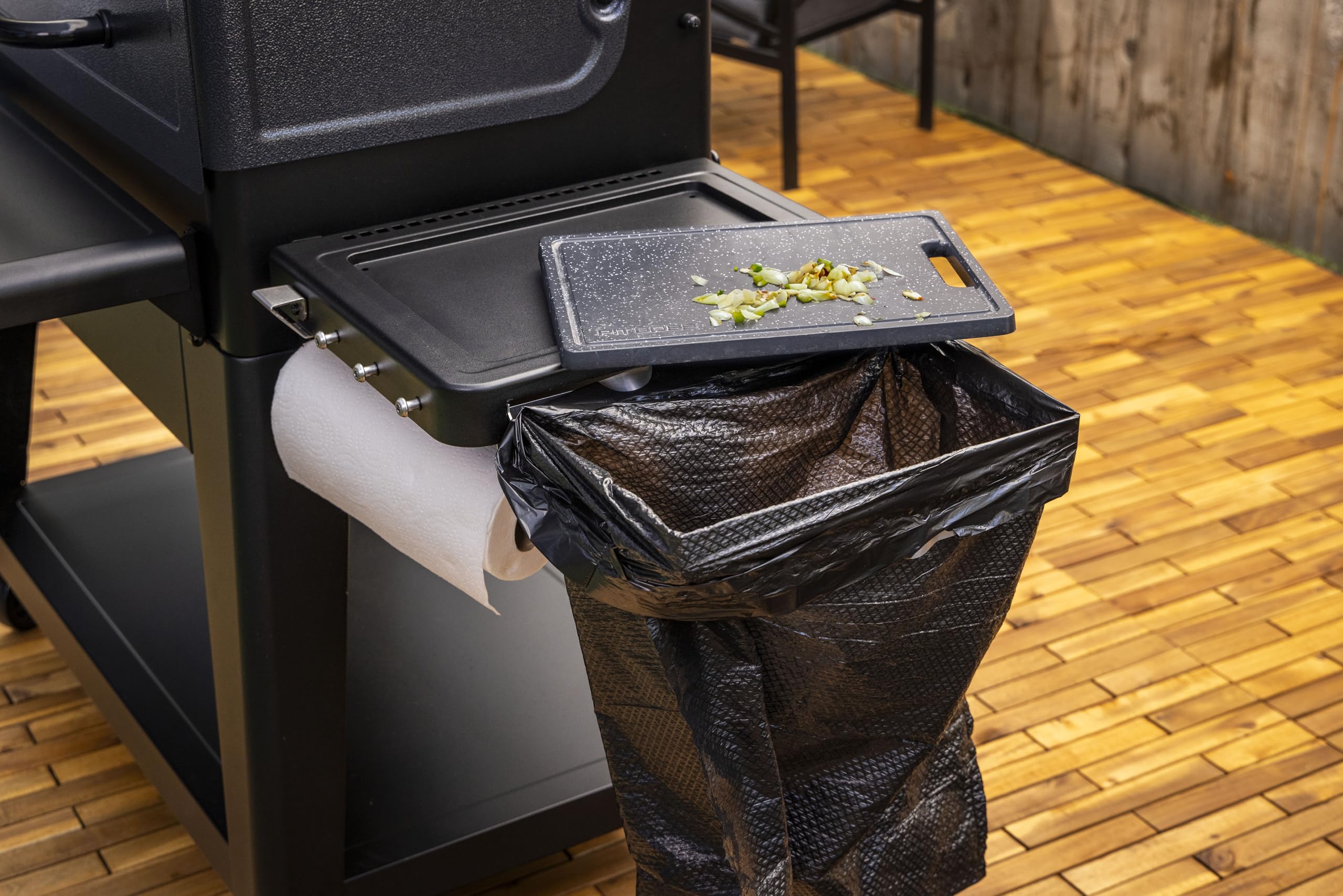 Built-in Prep Station: Paper towel holder, trash bag holder, removable cutting board, tool hooks, and bottle opener