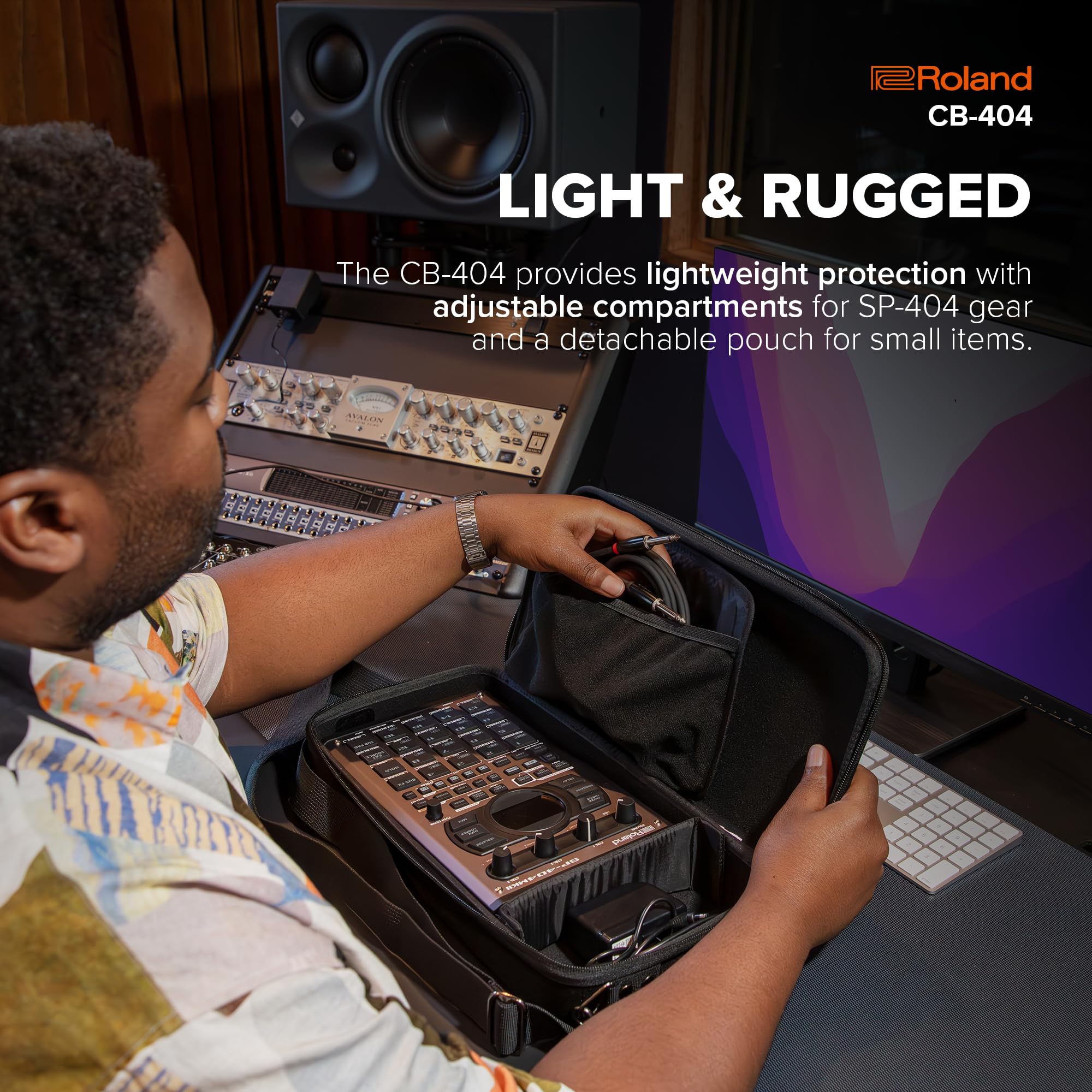 The CB-404 is the official carrying case for the Roland SP-404MKII and previous models in the iconic SP-404 portable sampler series. Streamlined and rugged, it features a semi-rigid EVA shell with a tough polyester exterior and a moveable internal partition that creates separate compartments for the sampler and items such as an AC adaptor. There’s also a detachable pouch for small items, plus a shoulder strap with a wide adjustment range. As a bonus, we’ve also included four orange knobs for customizing the look of the SP-404MKII model.
