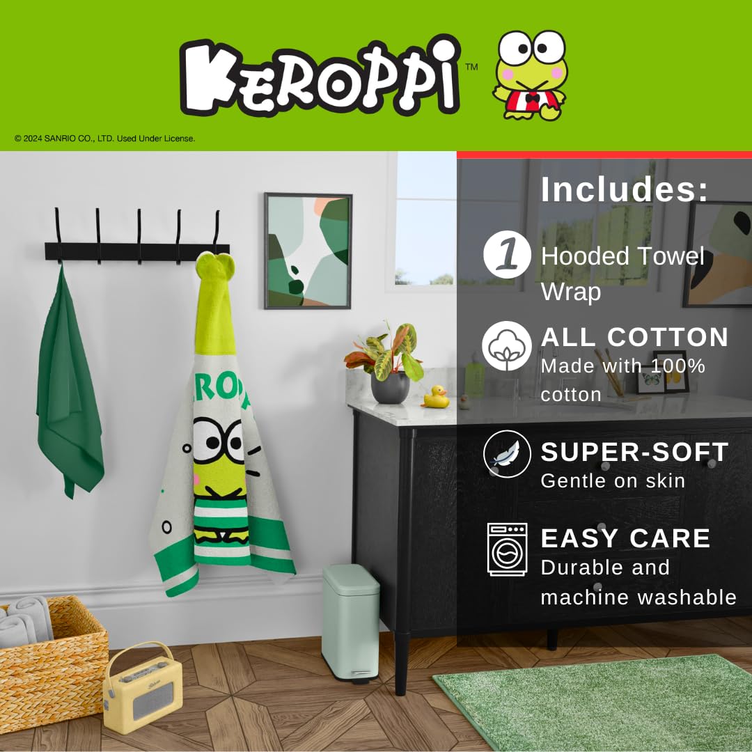 ITEM INCLUDES: A Keroppi hooded towel bath wrap measuring 24" (L) X 50" (W). It's large enough for growing toddlers and kids ranging from 3 to 7 years of age.