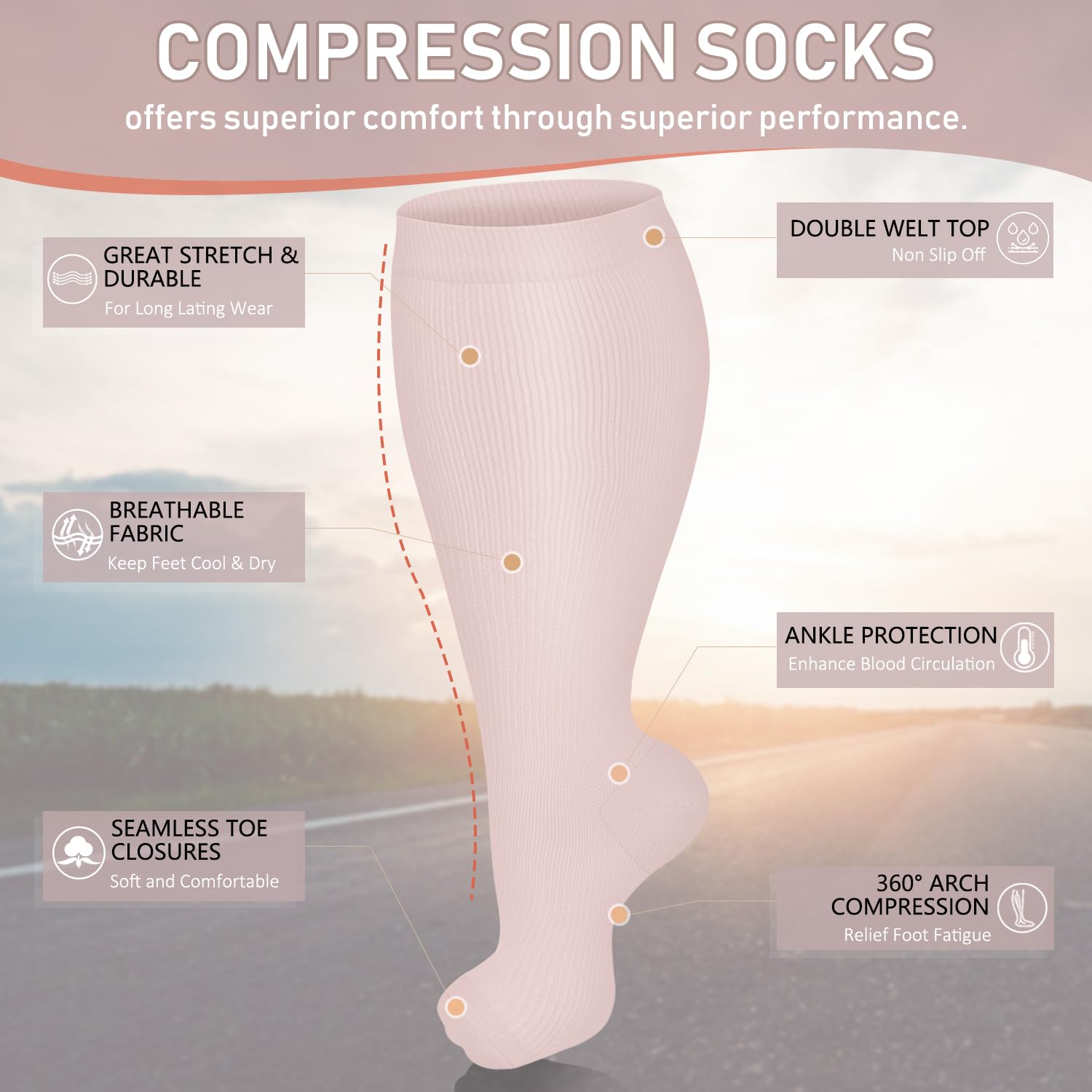 【More Size Choice】- Plus size (2XL-5XL) for ankle up to 16 inches, calf up to 28 inches’ circumference, you can refer to the size chart to choose the suitable size (and in general we suggest you choose the larger size if you are hesitating between two sizes). Our knee-high compression socks have nice and snuggly support without being too tight and enhance blood circulation effectively.