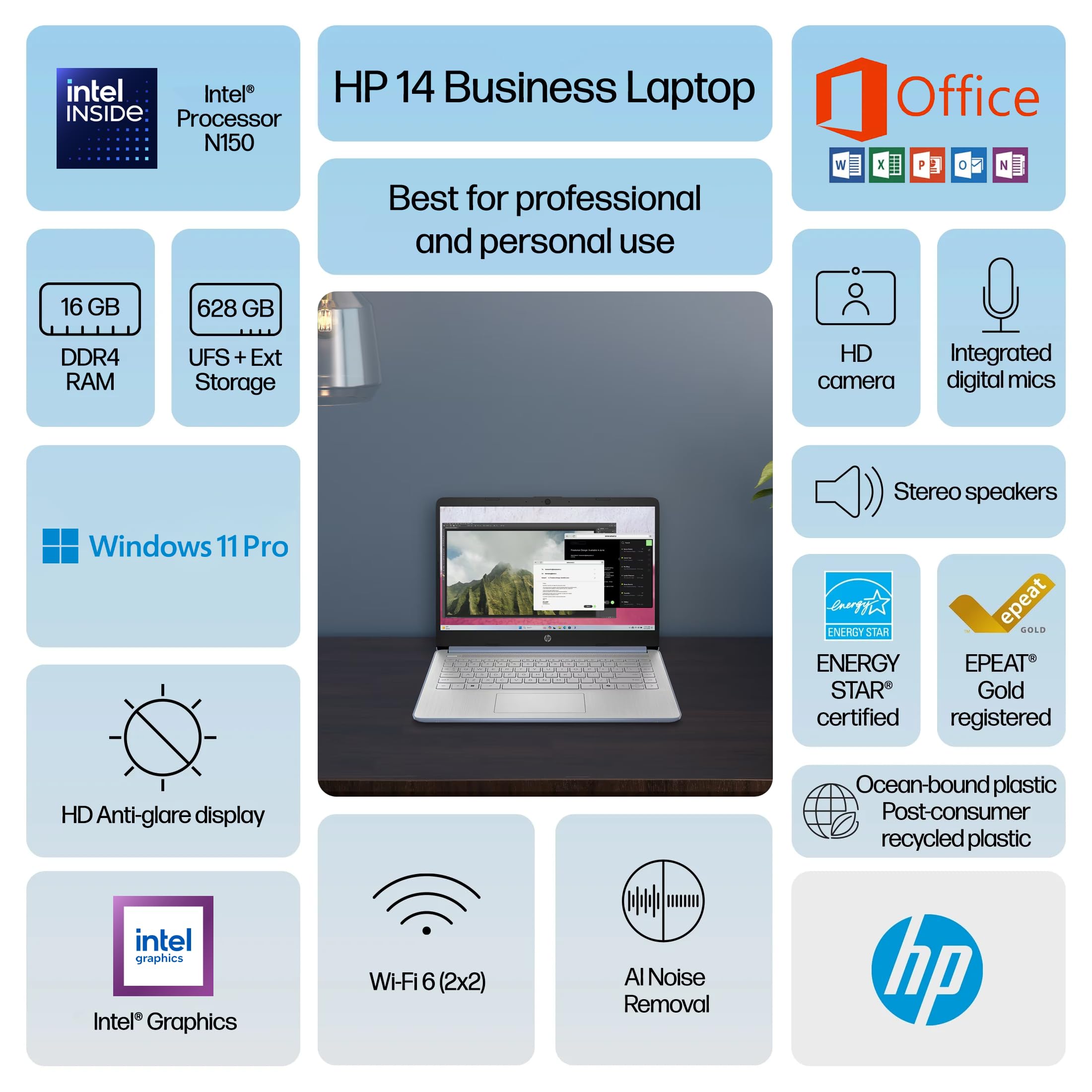 Performance to do more. All-day long. Designed to keep you productive and entertained, this 2025 HP 14-inch laptop PC features Copilot key for AI assistance, long battery life and a thin and portable design. The long-lasting battery life and HP Fast Charge help you stay in the zone longer. Bundle with MarxsolAccessory: 6-in-1 USB-C Docking Station Hub (with USB 3.0, 4K-HDMI, USB-C Connection, SD/TF Card Reader), 500GB Portable Storage Drive, USB extension cord, HDMI cable, mouse pad, and wireless mouse Processor: Quad-Core Intel Processor N150 (Up to 3.6 GHz Max Turbo Frequency, 6 MB Intel Smart Cache, 4 cores, 4 threads) Graphics: Intel Graphics Operating system: Windows 11 Pro Software: Free Lifetime Microsoft Office 2024 Memory: 16GB DDR4 Storage: 628GB (128GB UFS + 500GB External Drive) Display: 14-inch diagonal, HD (1366 x 768), micro-edge, anti-glare, 250 nits Connectivity: Wi-Fi 6 and Bluetooth 5.4 combo Audio: HD Audio with stereo speakers Keyboard: English, natural silver keyboard Webcam: HP True Vision 720p HD camera with temporal noise reduction and integrated dual array digital microphones Ports: 1x USB Type-C 10Gbps signaling rate (supports DisplayPort 1.2) 2x USB Type-A 5Gbps signaling rate 1x Headphone/microphone combo 1x AC Smart pin 1x HDMI 1.4b Battery: 3-cell, 41 Wh Li-ion battery, Up to 9 hours Color: Sky Blue Dimensions (W x D x H): 12.76 x 8.86 x 0.71 in Weight: 3.24 lbs