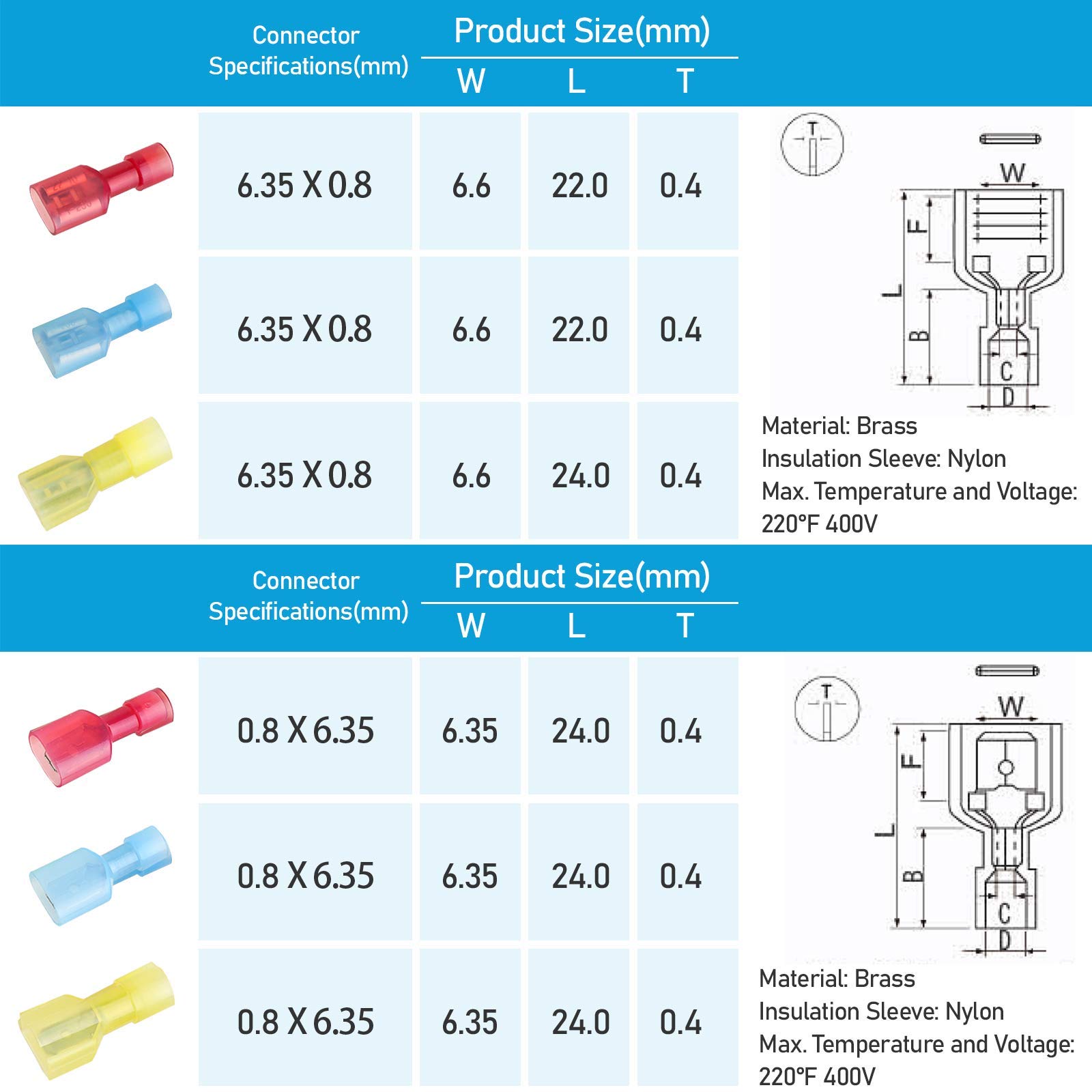 [COLOR and SIZE]: The connector assortment includes red (AWG 22, AWG 21, AWG 20, AWG 19, AWG 18, AWG 17, AWG 16), blue (AWG 16, AWG 15, AWG 14) and yellow (AWG 12, AWG 11 , AWG 10) nylon spade connectors that can be used on wire AWG from 22 to 10. Red, blue and yellow indicate different gauge size of electrical connectors for easy identification when using.