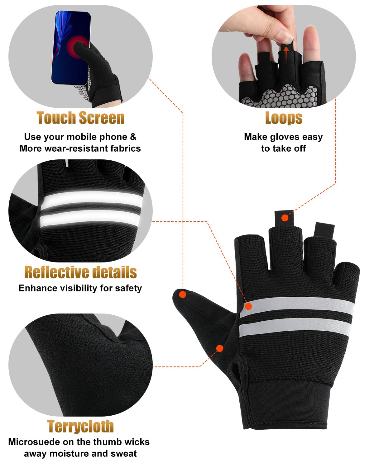 Human-Centered Design:Finger loops make it easy to remove the gloves.Moisture-wicking terry cloth thumb strip for sweat management.360° reflective trim enhances night visibility & safety.Touchscreen-compatible thumb tip stays connected on-the-go
