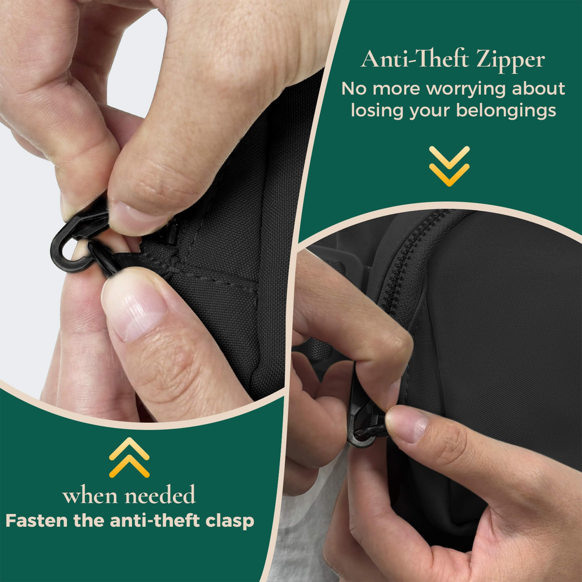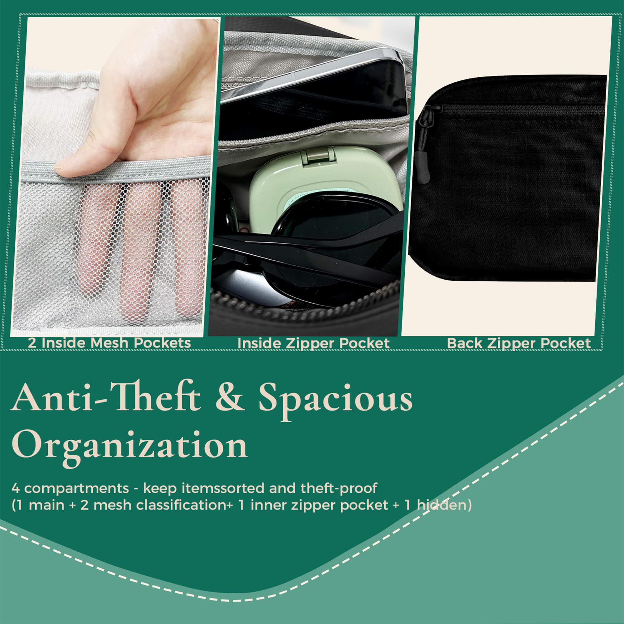 【Anti-Theft & Spacious Organization】 The anti theft crossbody bags secure your essentials with lockable zippers and a hidden back pocket. The waist bag fits smartphones up to 7.5", wallets, keys, and travel documents. 4 compartments (1 main + 2 mesh classification + 1 inner zipper pocket + 1 hidden) keep items sorted and theft-proof.