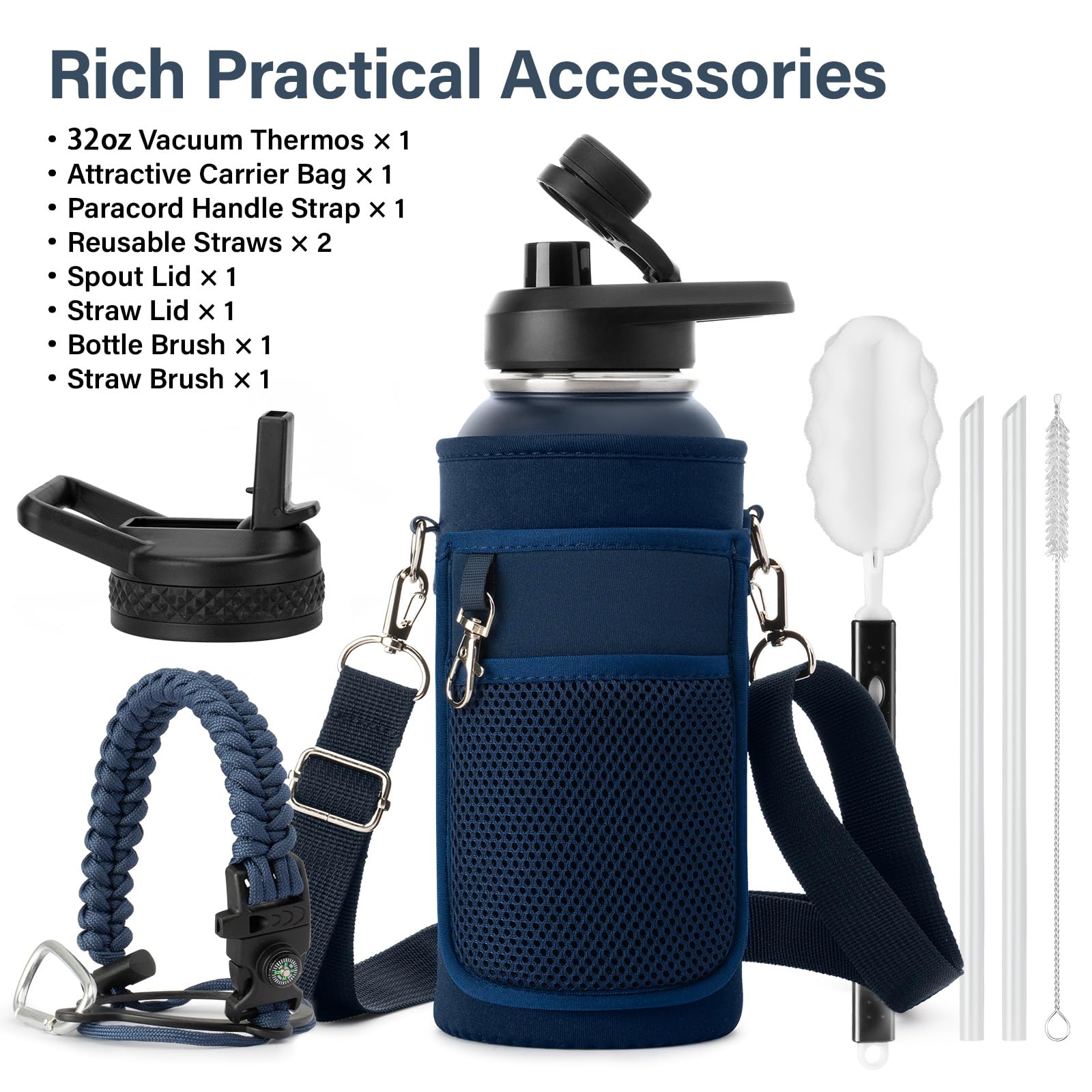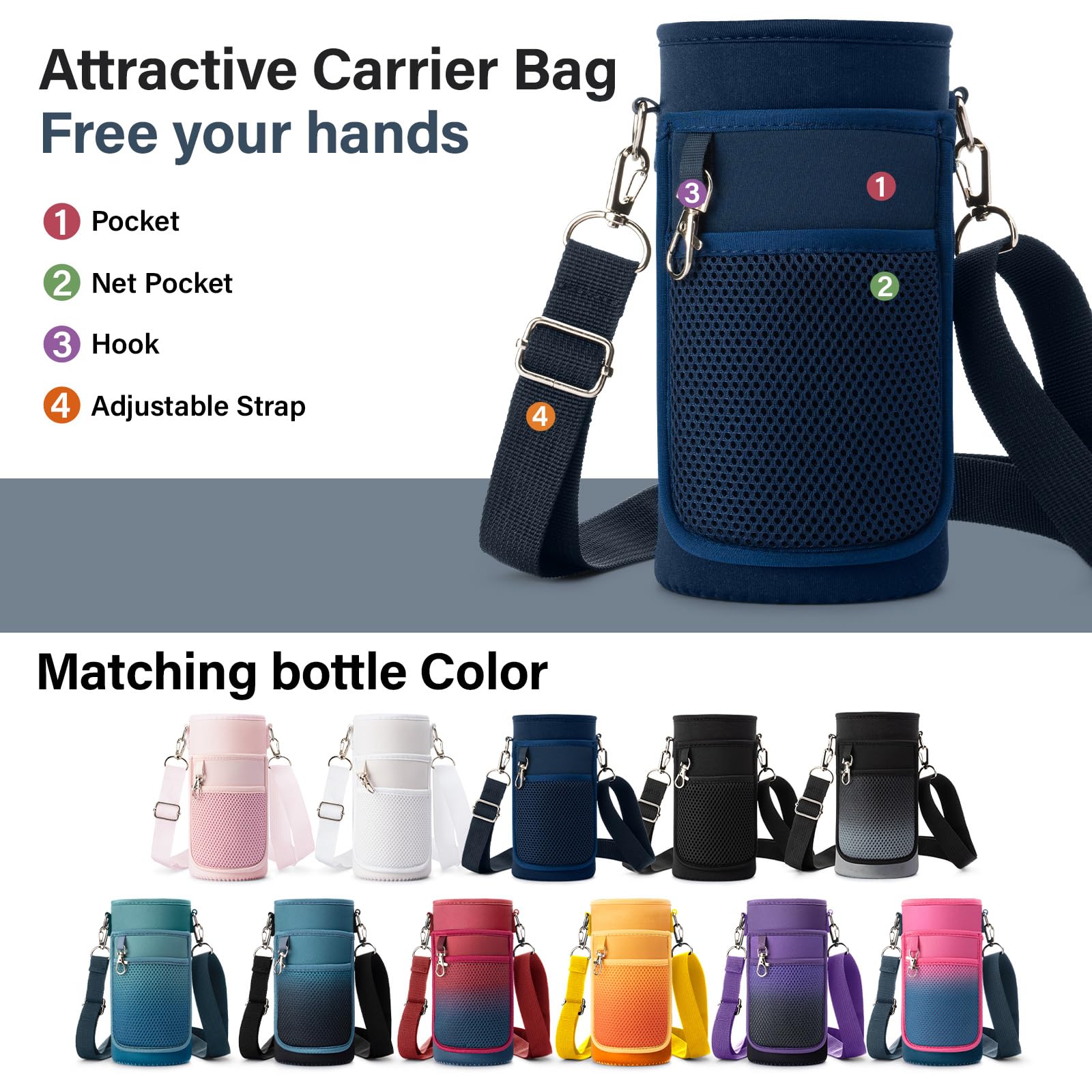 VERSATILE AND STYLISH CARRIER BAG:The colorful water bottle carrier bag is designed to match the bottle's body, adding a touch of flair while providing practical functionality. The shoulder strap and carabiner make it easy to carry and hang, whether you're out on a hike or running errands. Plus, the small storage bag for your phone and a hook for keys make this bottle even more versatile.