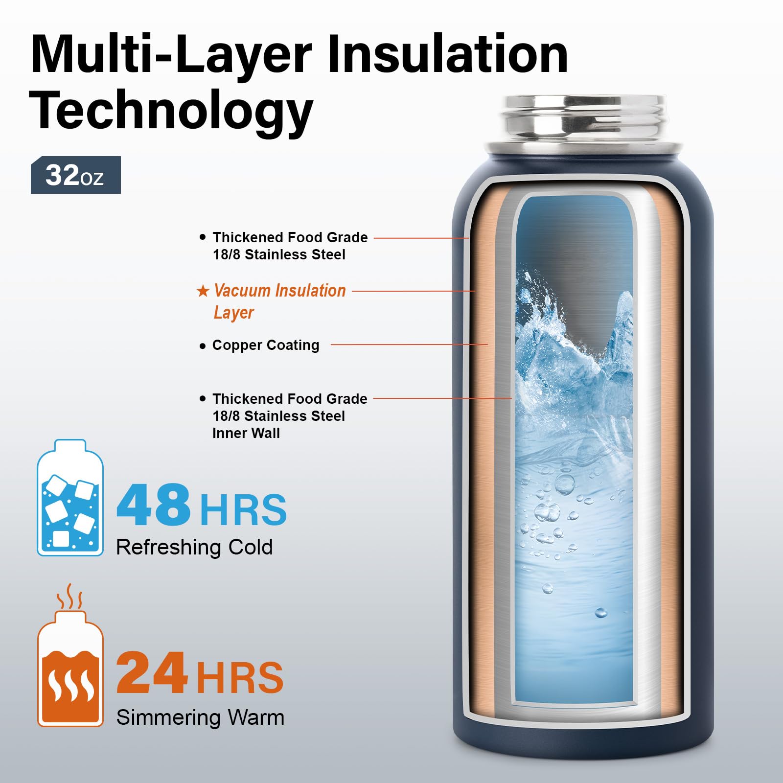 THE MULTI-LAYER INSULATION TECHNOLOGY FEATURES: the first layer is a thick food-grade 18/8 stainless steel inner wall; the second layer has a copper plating that reduces heat transfer; the third layer is a vacuum layer that prevents heat loss. As a result, you can enjoy an insulated water bottle that keeps beverages cold for up to 48 hours and hot for up to 24 hours, making it perfect for any adventure, whether it's a long hike or a busy workday.