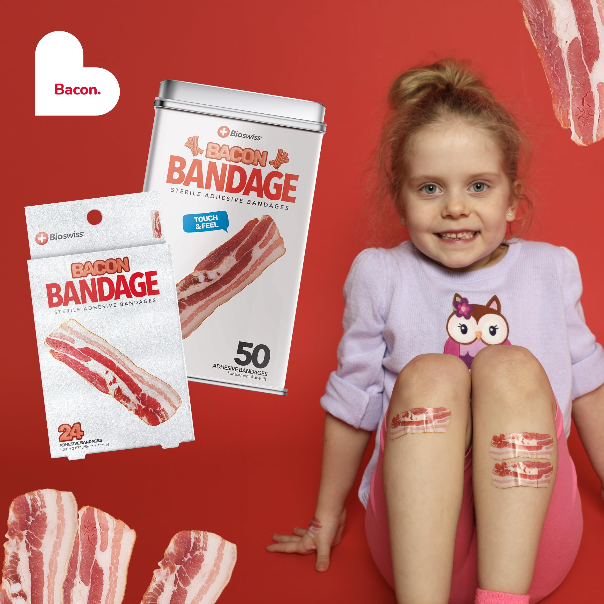 24 BACON BANDAGES: Bacon-shaped adhesive bandages pack helps protect cuts, scrapes, and minor wounds while making healing less stressful