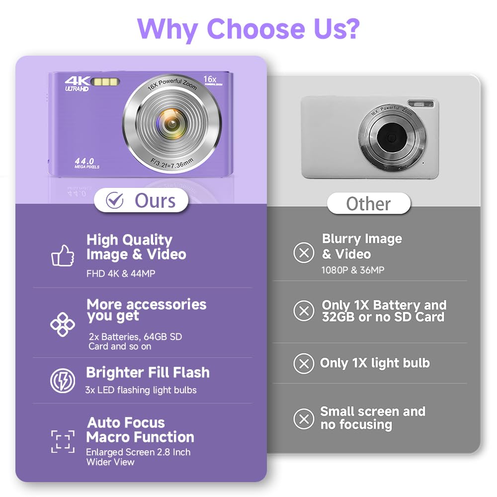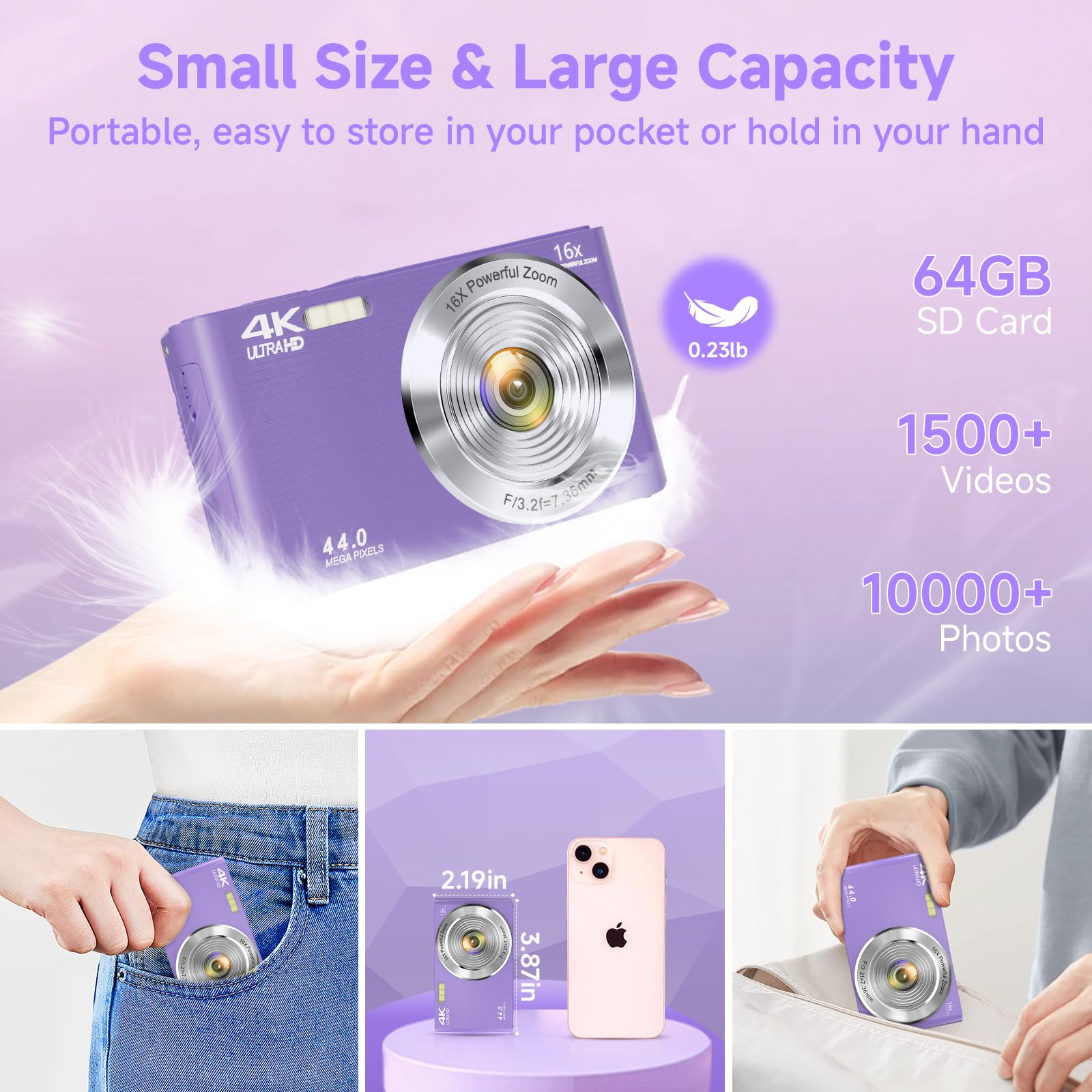 Perfect Present & What You Get: An ideal choice for beginners, boys, girls, kids, teens on birthdays, holiday. Include: 1x purple digital camera; 2x batteries; 1x usb-c cable; 1x user manual; 1x 64GB SD card; 1x wiping cloth; 2x lanyards; 1x camera bag