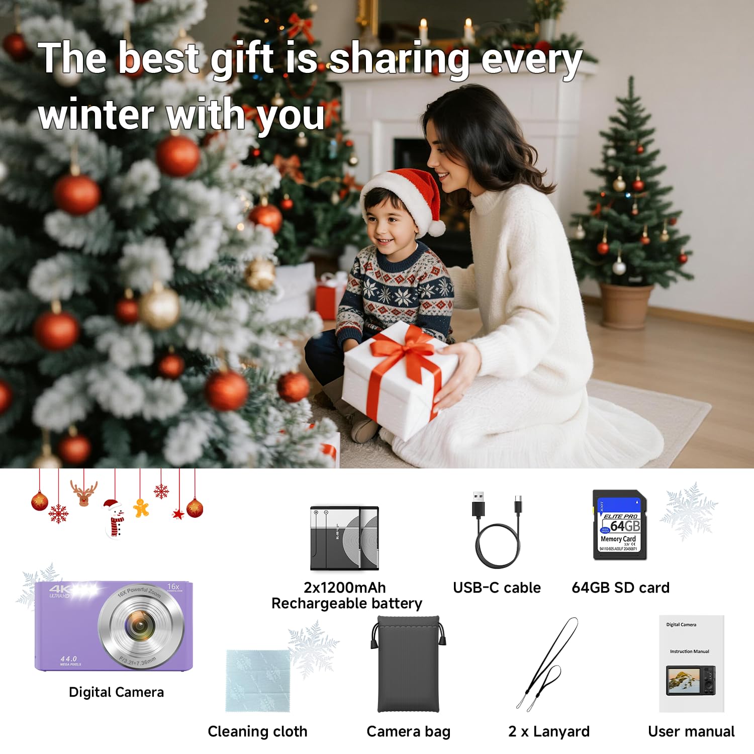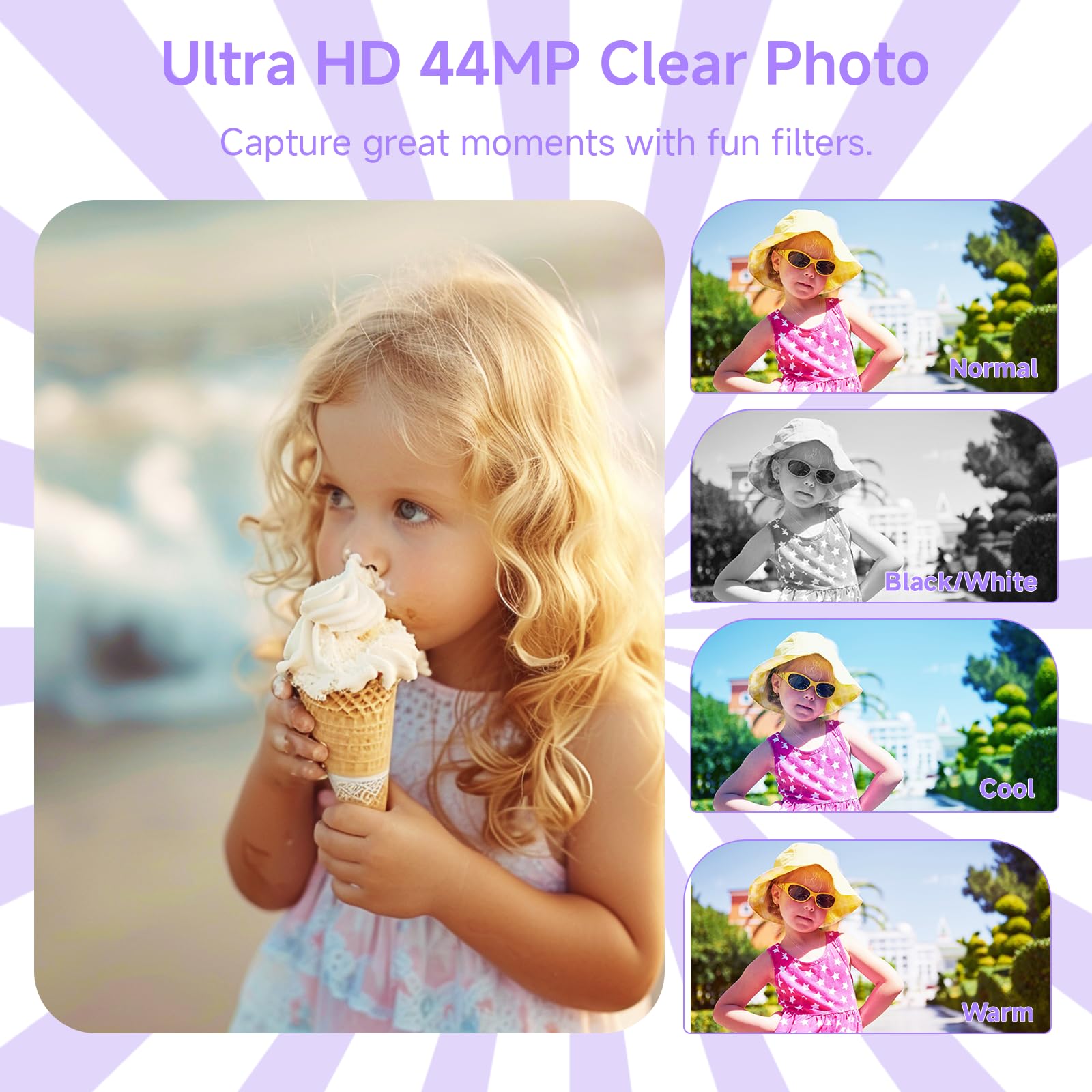 FHD 4K 44MP Camera with 64GB SD Card:The digital camera for kids takes clear 44MP photos and 4K FHD videos. It features a large 2.8 inch UHD display for easy viewing and includes a 64GB SD card, providing plenty of space to save all their favorite moments