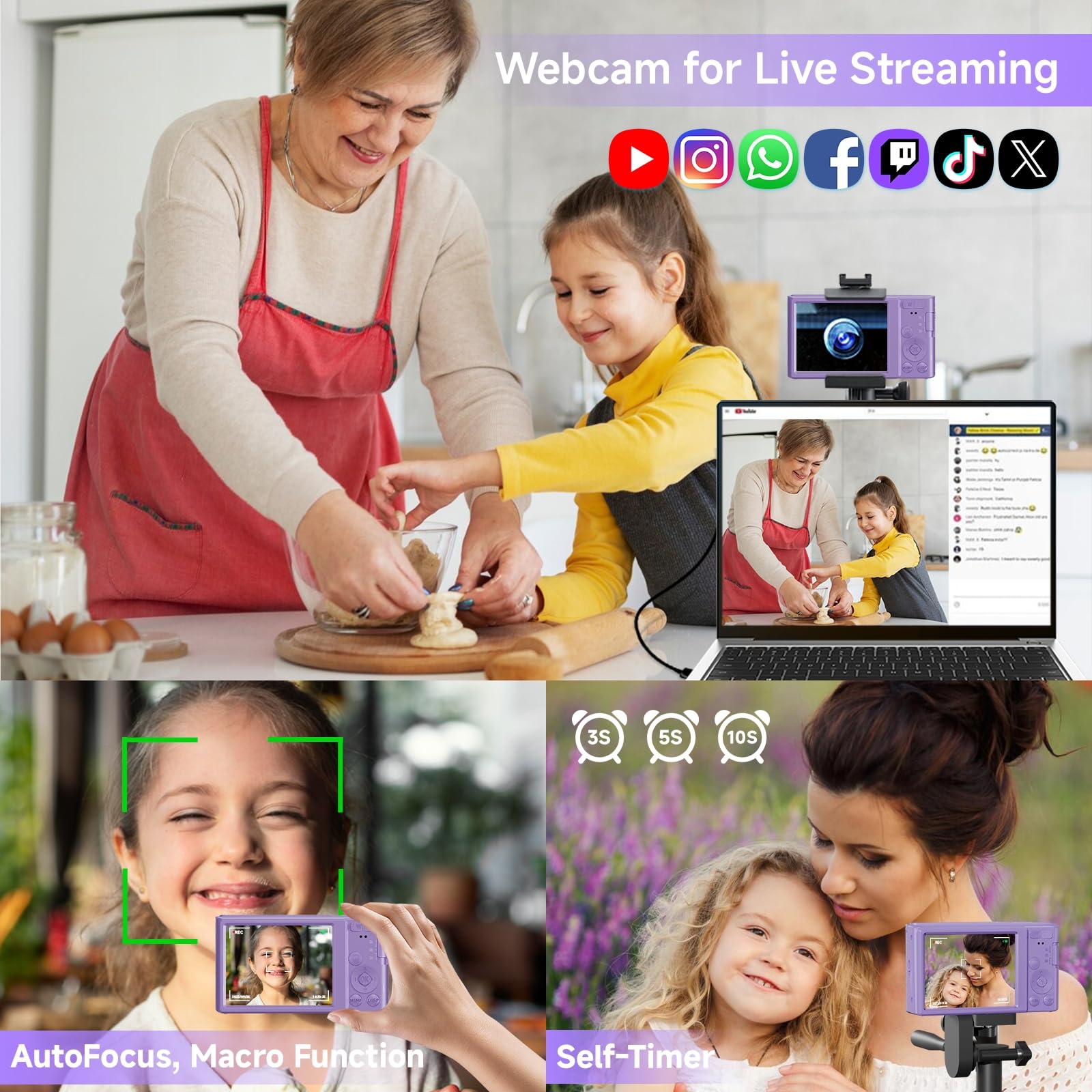 Vlog Webcam and Upgraded Fill Light:The digital camera with video can be used as a live webcam, the pause function allows you to pause while recording. Built in 3 flash bulbs make the illumination brighter, helping you take clear photos even in low light